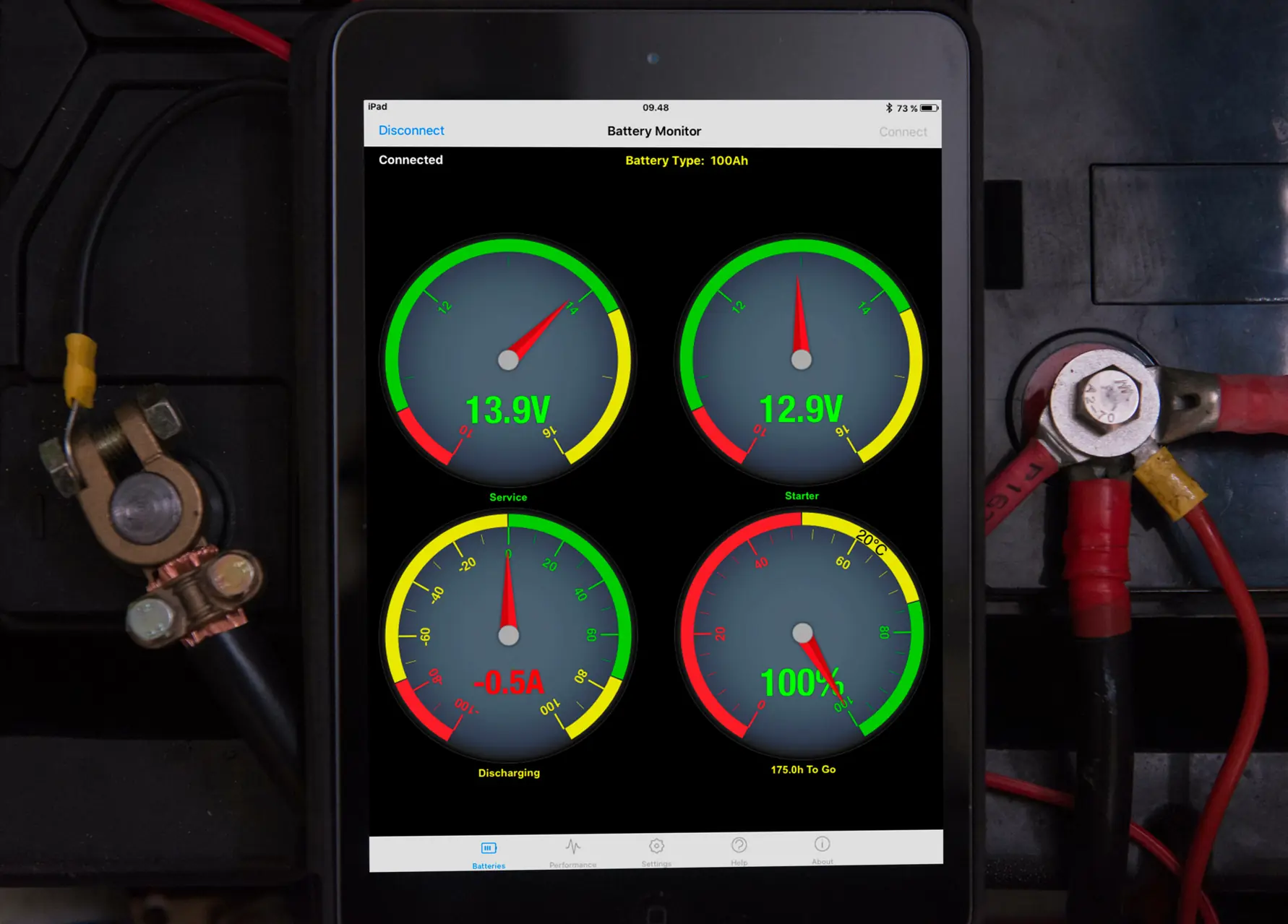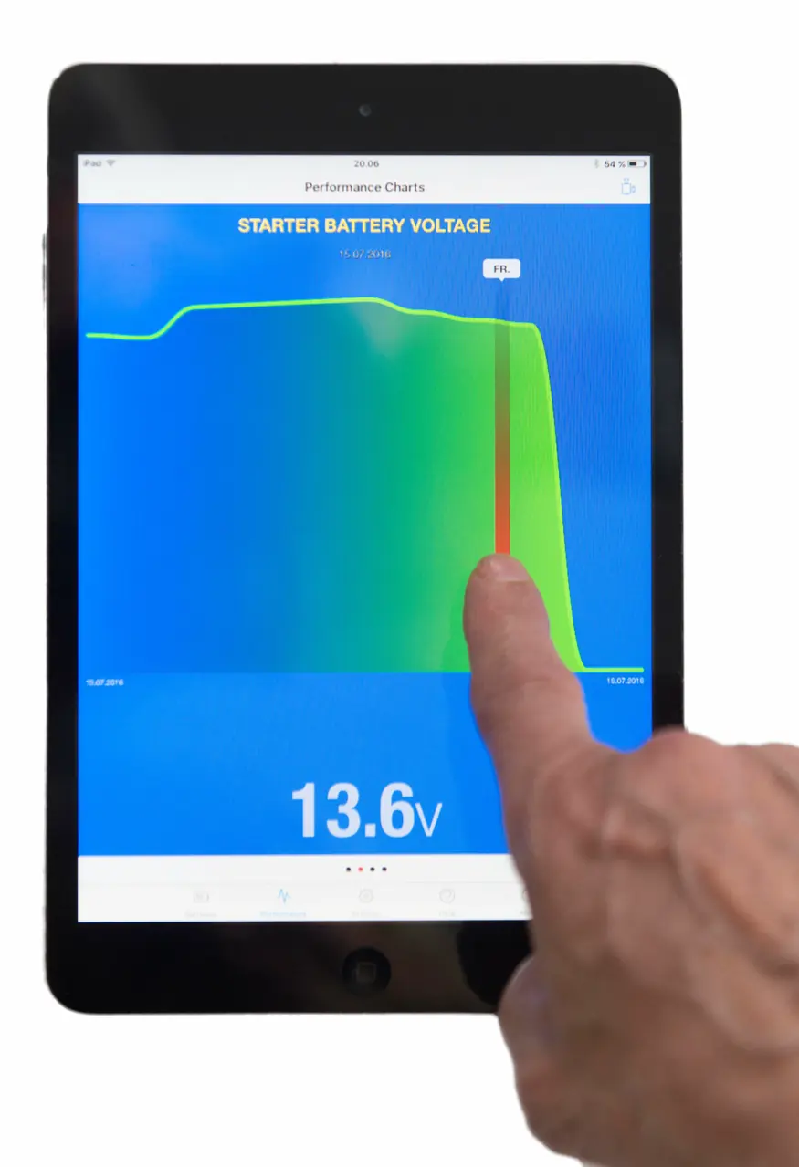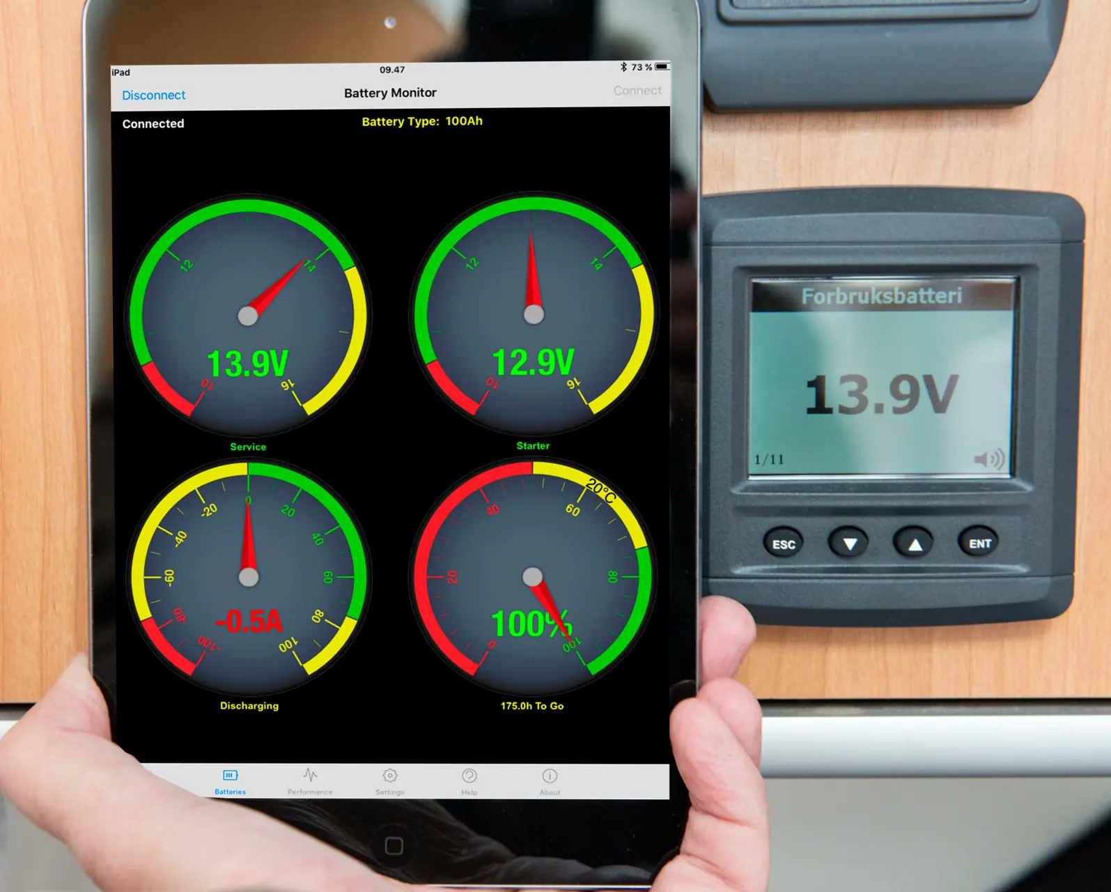 For Apple-brukere finnes en mer sofistikert app med bedre design og mer informasjon. Denne kan kjøpes fra Apple App Store for en drøy femtilapp. Kan brukes på iPhone og iPad-modeller, samt nyere Apple Watch. Vi valgte å laste ned App på iPad mini. Denne bruker vi mye i båten, til navigasjon og annet. Da synes vi det er praktisk å bruke denne til å få batteri-informasjon. Vi får opp informasjonen på et elegant og oversiktlig dashbord med fire ulike instrumenter. De viser spenning på forbruksbatteri og startbatteri i volt, forbruk eller lading i ampere og hvor mye strøm det er igjen i batteribanken i prosent. I tillegg er det underinformasjon om hvor lenge strømmen vil vare med aktuelt forbruk eller hvor lang tid det er til batteriet er ladet. Dessuten kan man gå inn i historikk og hente ut oversiktlig informasjon om det meste. For eksempel spenning på forbruksbatteri fra time til time, eller historikk på lading.