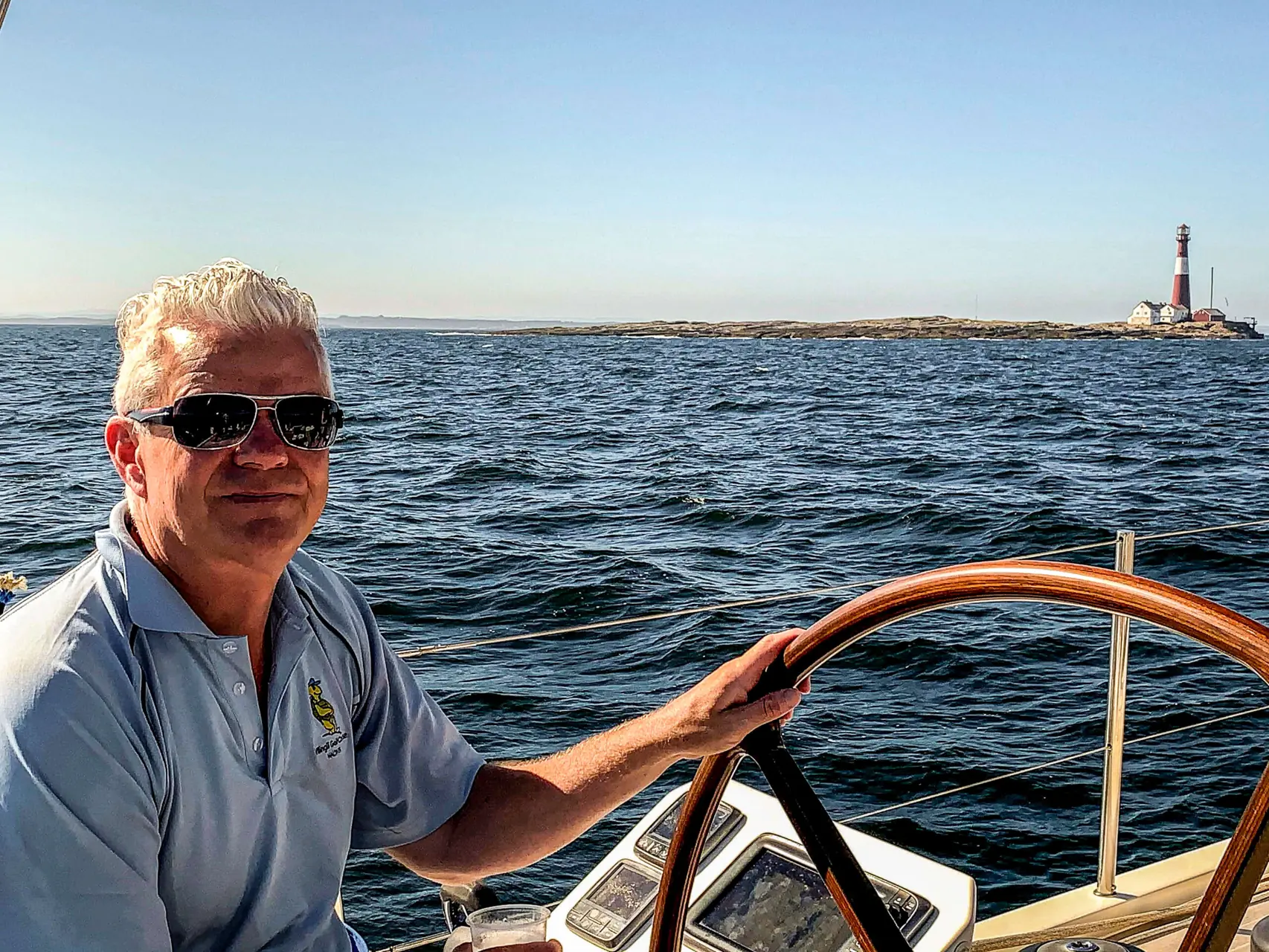 Grå seil over Nordsjø seiler. Det er godt å se Færder Fyr. Nesten litt klump i halsen. Underveis har vi hatt doble vakter. En hovedvakt og en standby, men begge på dekk, ihvertfall i cockpit. Dessverre måtte vi håndstyre de siste dagene fra Dovers breddegrad. Maten underveis hadde Daniella laget før avreise og frosset ned. Jeg hadde gitt beskjed om mat til fire personer i fire uker. Vi kommer til å spise fra fryser’n i lang tid...
