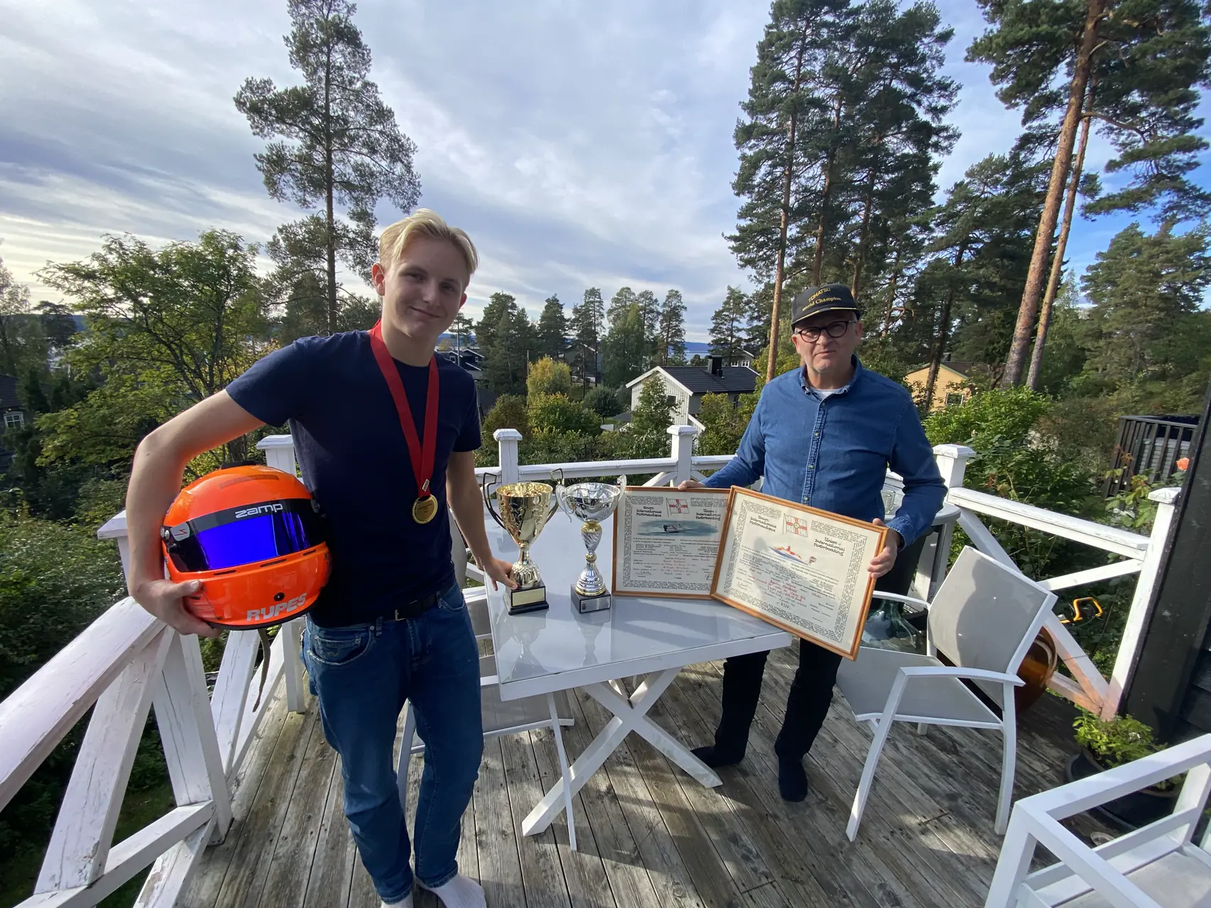 – Jeg begynte altså når jeg var 13 år, forteller Oliver. Men i de første race møtte jeg konkurrenter som hadde kjørt siden de var 9 år, for det var lovlig i andre land. Men utviklingen taler for seg, 4 år senere har Oliver sikret seg 1 VM, i Tallin hvor det var med 37 båter. 1 Nordisk mesterskap og 2 NM. Alle i klasse V15. I 2022 vant vi faktisk alle internasjonale race vi deltok i og alle norske. I ett race i Tyskland var det med 37 båter.