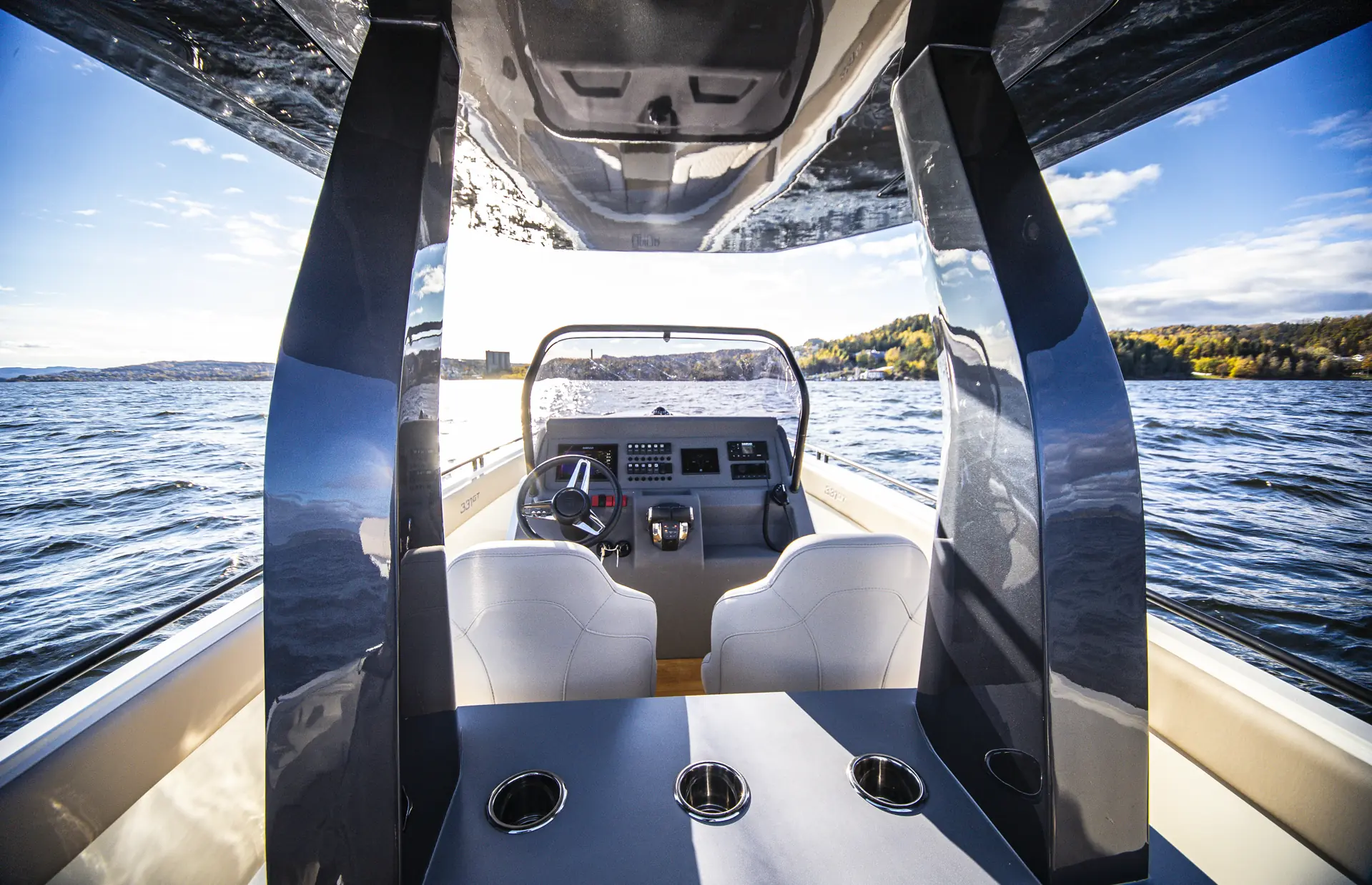 Vår testbåt har fastmontert karbontak over førerposisjonen, som har to solide stoler i fartsretning for sitte- og ståposisjon. Dashbordet er oversiktlig, ryddig og tradisjonelt med mulighet for to kartplottere på inntil 9 tommer, VHF og DAB-radio/musikkspiller. I samme konsoll har produsenten fått på plass et forholdsvis romslig toalettrom med elektrisk spyletoalett og vask. Kunden har for øvrig en rekke valgmuligheter på tekstiler og dørk, og i vår båt er det teakdørk som setter prikken over i-en, og bidrar til å gi et luksuriøst preg for skjærgårdsjeepen.