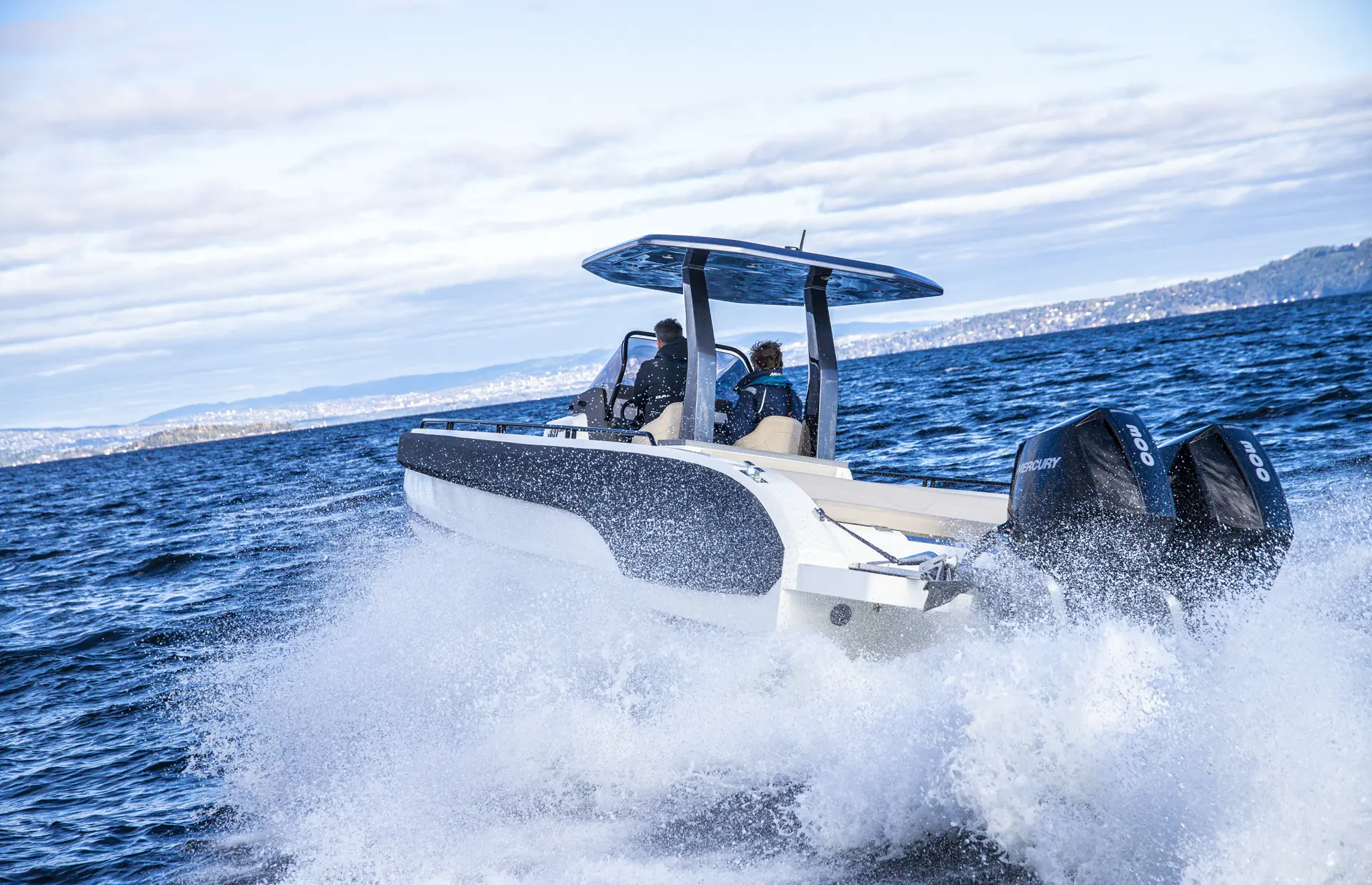 Vi legger ut på prøvetur i Indre Oslofjord og får brynt oss på forholdsvis krappe bølger og rotete sjø fra 0,5 til 1 meter. Båten har en forholdsvis flat kjørestil og takket være steppene krever den ikke mye trim for å løfte seg ut av vannet. V-bunnen gir en etter forholdene en myk gange – og skroglengden på 10,3 meter bidrar også til at båten oppleves stødig. Skroget bidrar også til at båten ligger godt når vi legger den over i svinger og er leken, uten at vi klarer å få den til å slippe i sving. Med vårt motoralternativ på 2 x 300 hk. Mercury Verado måler vi 58 knop på toppfart.
