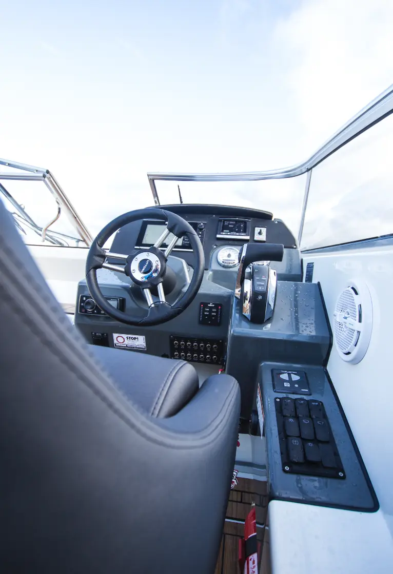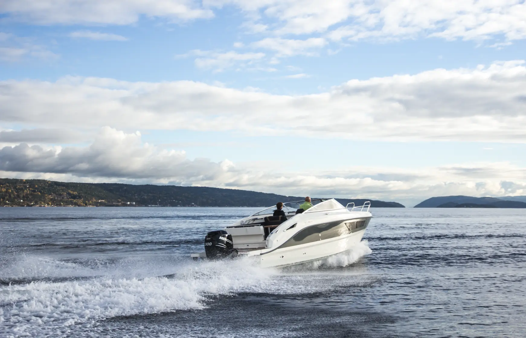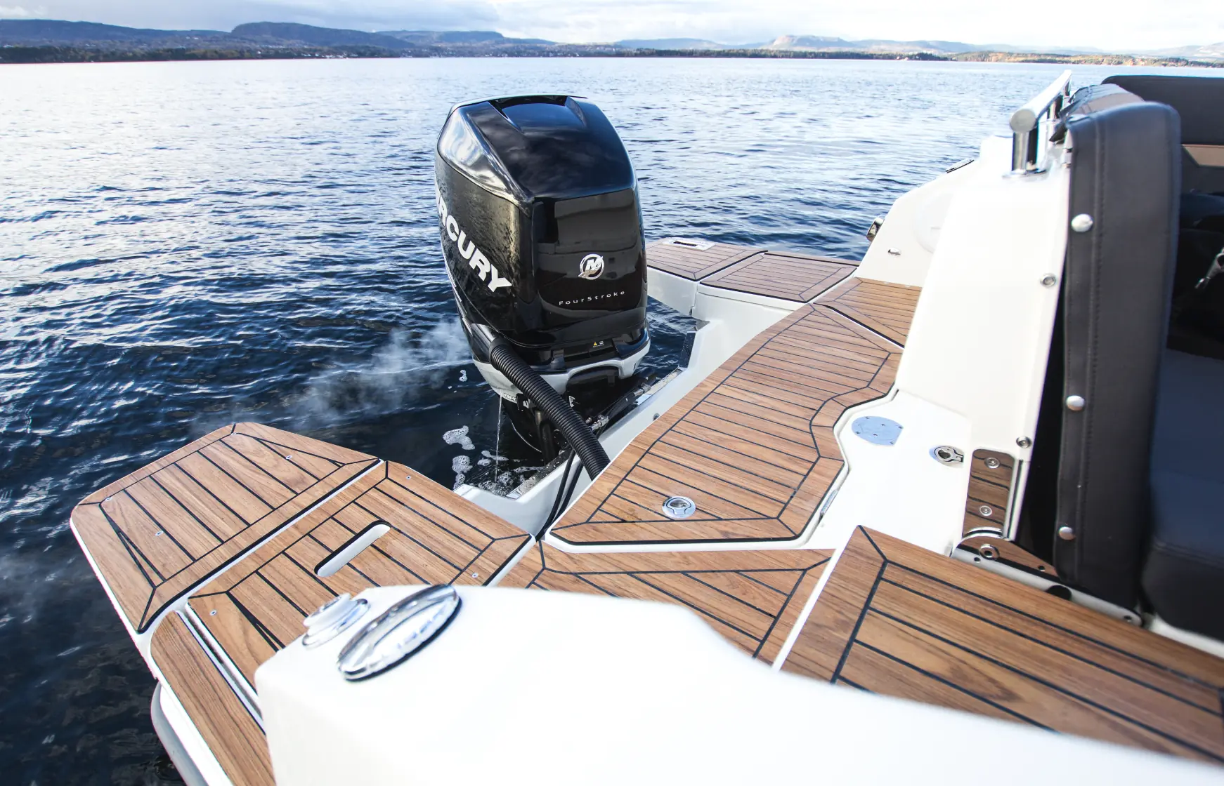 Med Mercury Verado 300 hk. på hekken opplever vi lite støy, og det er minimalt med støy og ulyder fra skroget. Vi legger båten raskt i plan, og fra rundt tretti knop til maksfart på 39 knop, oppleves den også som ganske sprek. Den er responsiv på gass og rattutslag, og best av alt krever den ikke aktiv trimming. Det er ikke vanskelig å få den til å gå optimalt, og det kan være viktig for normalt bruk. Anbefalt motorstørrelse er 250 hk eller 300 hk, og mellom disse skiller cirka fire knop på toppfart, men den leveres også med 2 x 150 hk eller 2 x 200 hk.