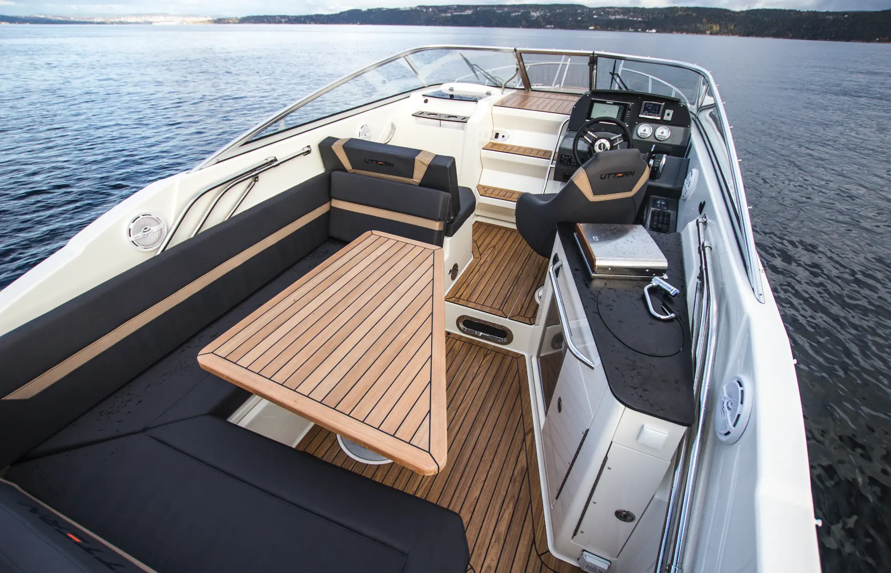 Planleggingen startet bare for et års tid tiden, og alt er nyutviklet fra skrog til overbygg. Selve skroget er naturligvis ikke bygget for topphastigheter, selv om potensialet er på like over førti knop. – Den skal være behagelig og enkel å kjøre for normalt bruk, forteller salgssjef hos importøren, Ulf Bjørnstad. Han kan fortelle at selve utviklingen foregår i Amerika hos eierselskapet Brunswick, der norske forhandlere spiller en viktig rolle i arbeidet. – Da var det særlig elementer som en bred stikkøye og eget toalettrom som gikk igjen, og som vi mener Uttern har løst godt for denne modellen, understreker han ovenfor Båtens Verden.