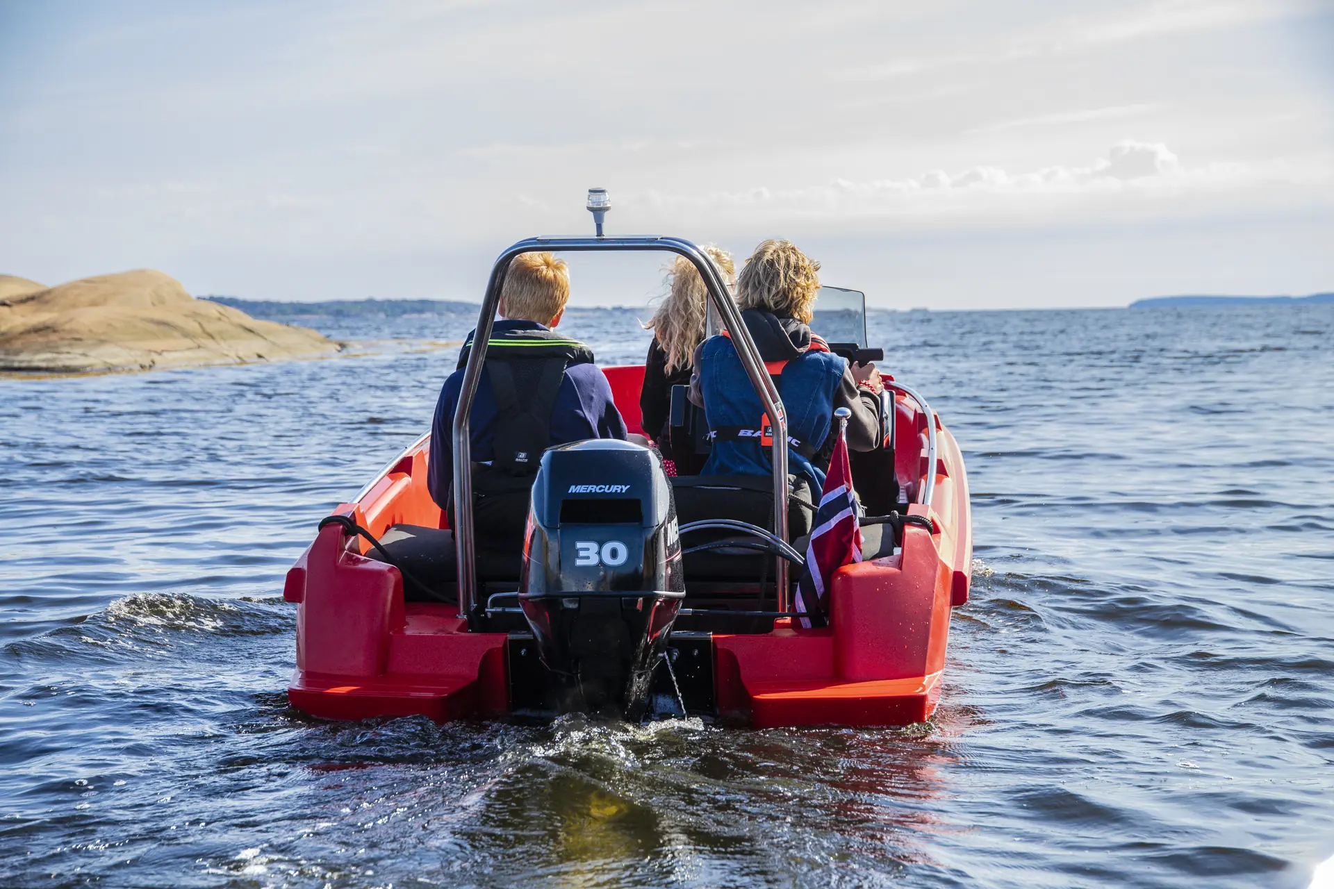 Vår testbåt er utstyrt med en 30 hk. fra Mercury, og med to ungdommer bak og en foran konsollen, var planingsterskelen forholdsvis markant.