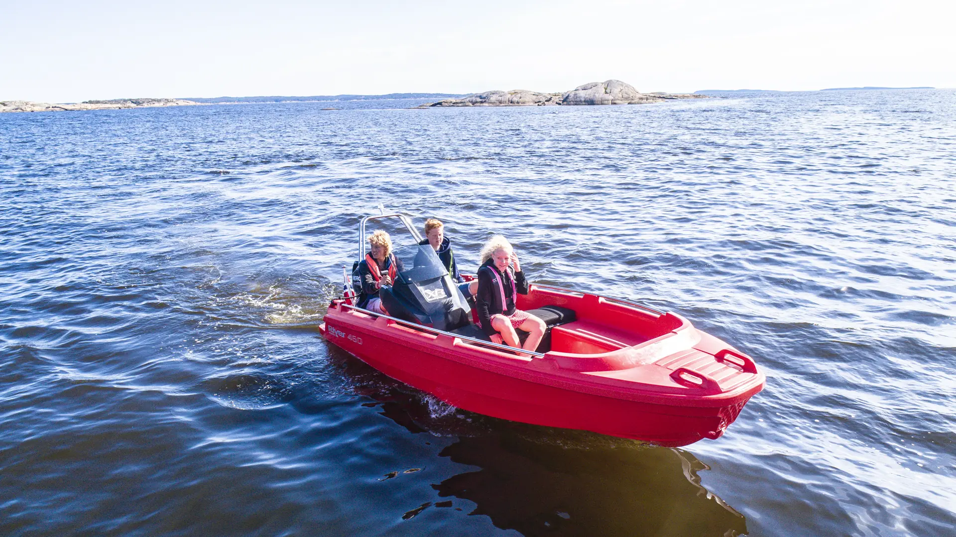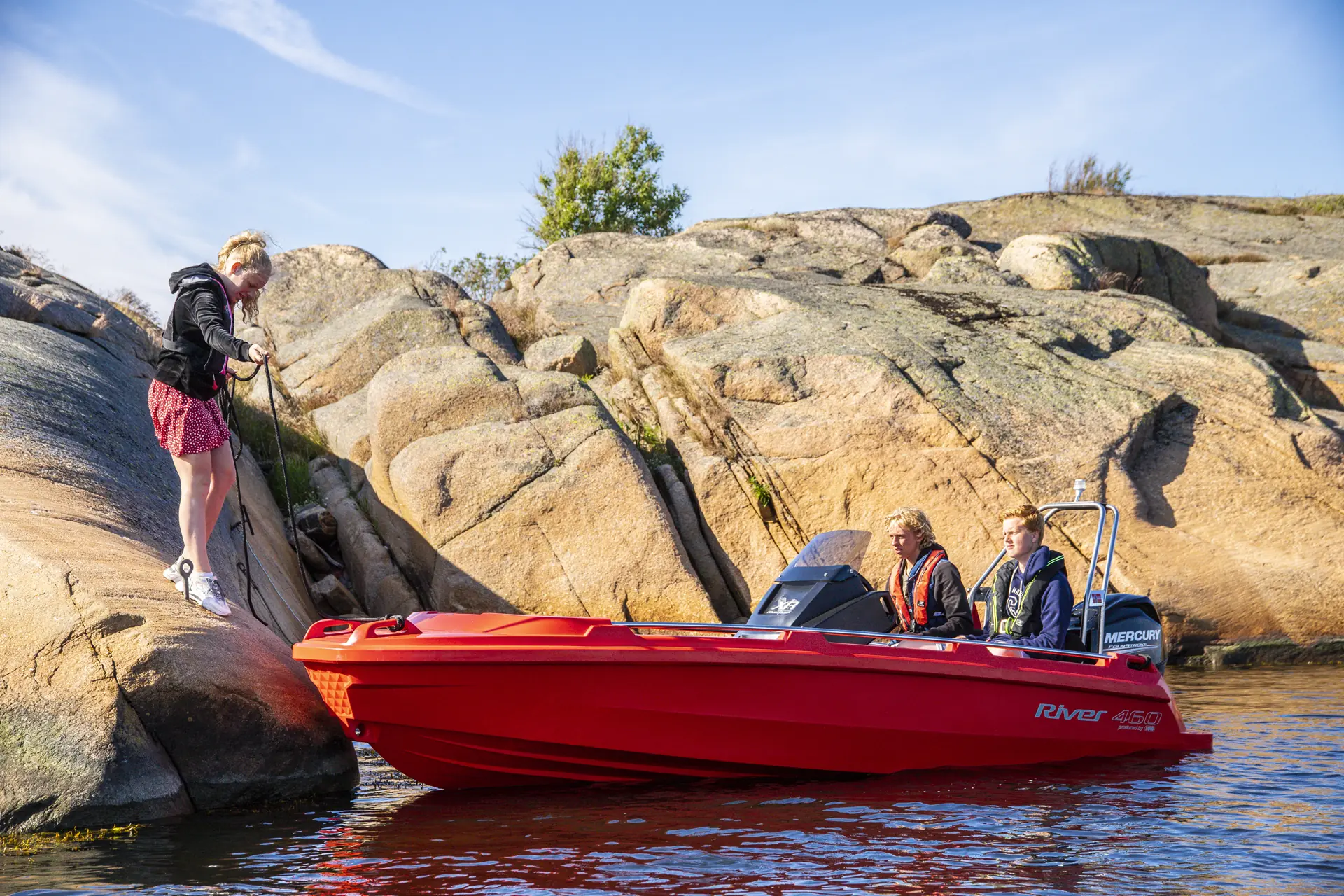 River 460 er blitt en typisk landstedsbåt med mer lagringsplass og en styrekonsoll med vindskjerm, og målgruppen er typisk hytteeiere og de som ønsker en vedlikeholdsfri båt for dagsturer i indre skjærgård. Og ikke minst ungdom. Vi har derfor fått med oss ivrig båtbruker Leo Helgesen (16) til å prøvekjøre nykommeren. Han har selv en ungdomsbåt og flere i vennegjengen har lillesøster River 350, som er godkjent for inntil 15 hestekrefter. Ergo begynner 16-åringene å sikle på større motor og båt.