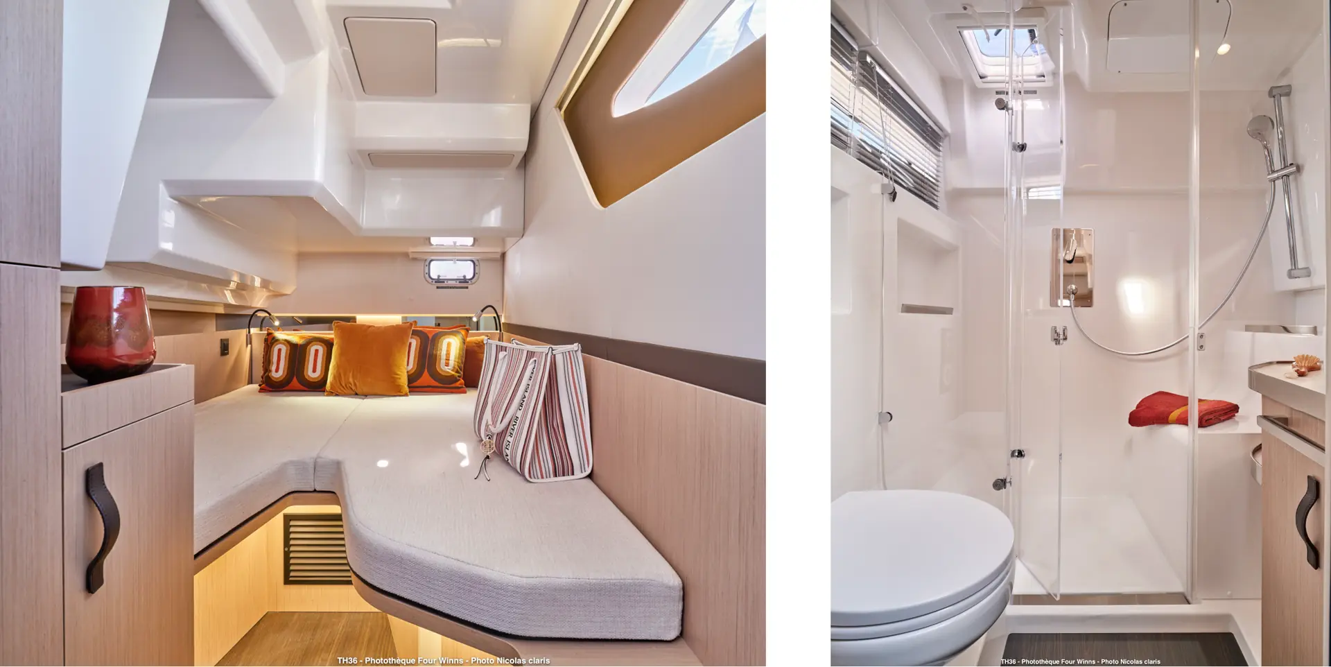 Four Winns TH36 er en «bow rider» med to L-salonger mot hverandre akterut, og et baugparti med salong for cirka seks-ni personer. Også her kommer en bredde på 4,4 meter godt med.