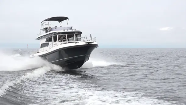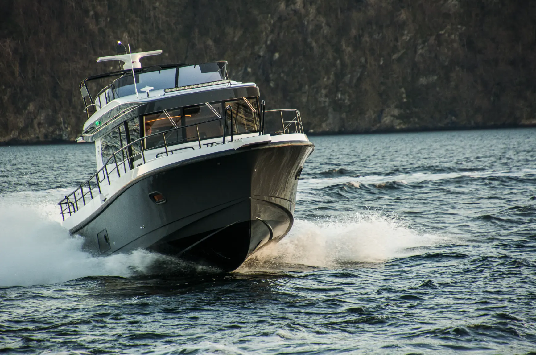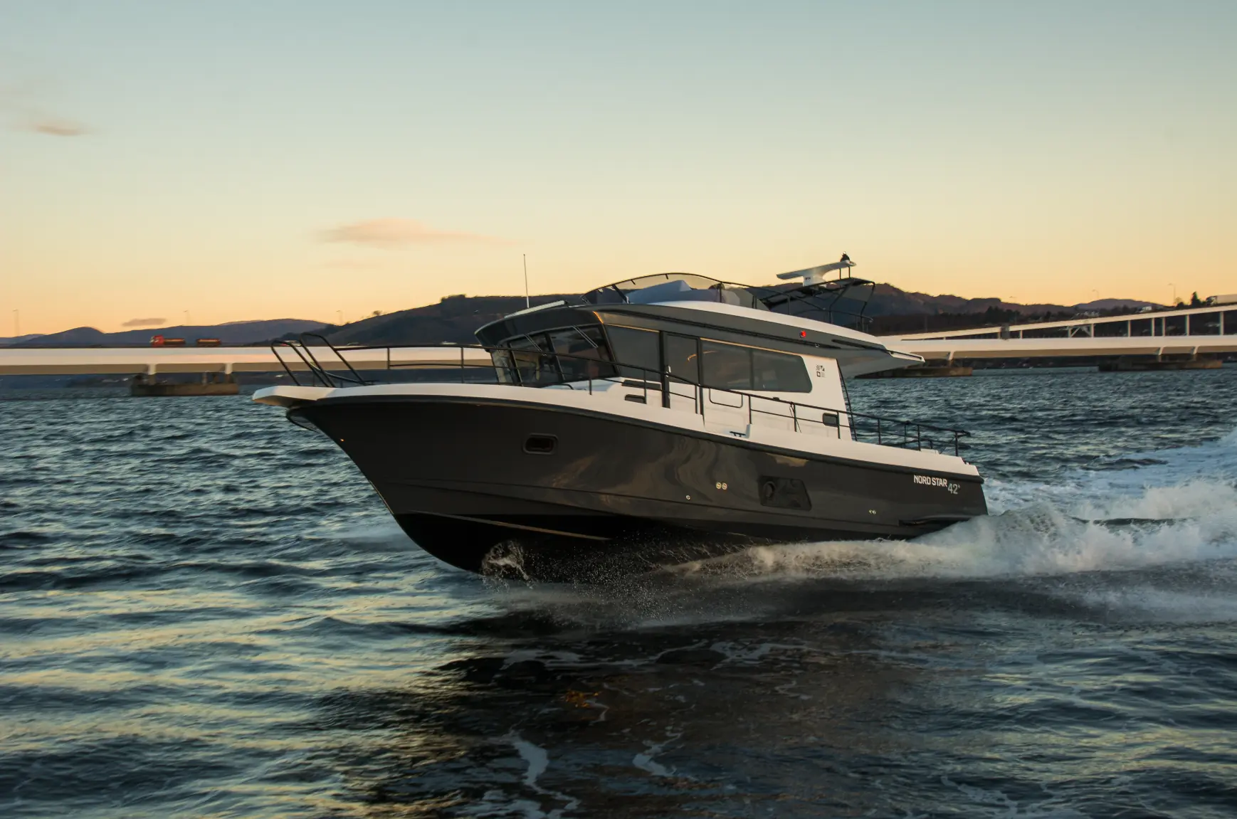 Nord Star 42+ er et velkjent og ikke minst velprøvd styrhusbåtkonsept. Det betyr at den er bygget for bruk hele året og i tøffere omstendigheter. Den har en dyp v-bunn med 18,5 grader i hekken, legger seg godt over i svingene og byr på forutsigbare kjøreegenskaper. Vår testbåt har interceptorer fra Zipwake som under vår testtur bidro til god stabilitet. 44-foteren utrustes med to Volvo Penta D6 fra 340 hk. opp til 440 hk., eller med IPS600 eller IPS650. Med største motoralternativ er fartspotensialet 45 knop. Vår testbåt har IPS600 med toppfart på 39 knop og et forbruk på 3,3 liter per nautisk mil i marsfart mellom 28-32 knop.