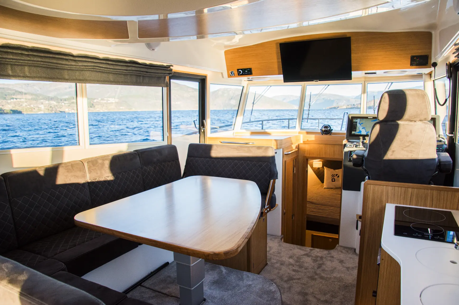 Trearbeidet og finishen om bord lukter finsk premiumkvalitet og er gjennomgående innvendig i båten. Salongen har to vinklede hjørner og har sitteplass for seks-syv personer, med et stort, tiltbart bord. Du sitter høyt nok til å kunne se ut, også foran over baugen. Førersetet er påkostet med ekstra demping, høy rygg og armlener, og på motsatt side feller du salongryggen bak for å få to sitteplasser i fartsretning.