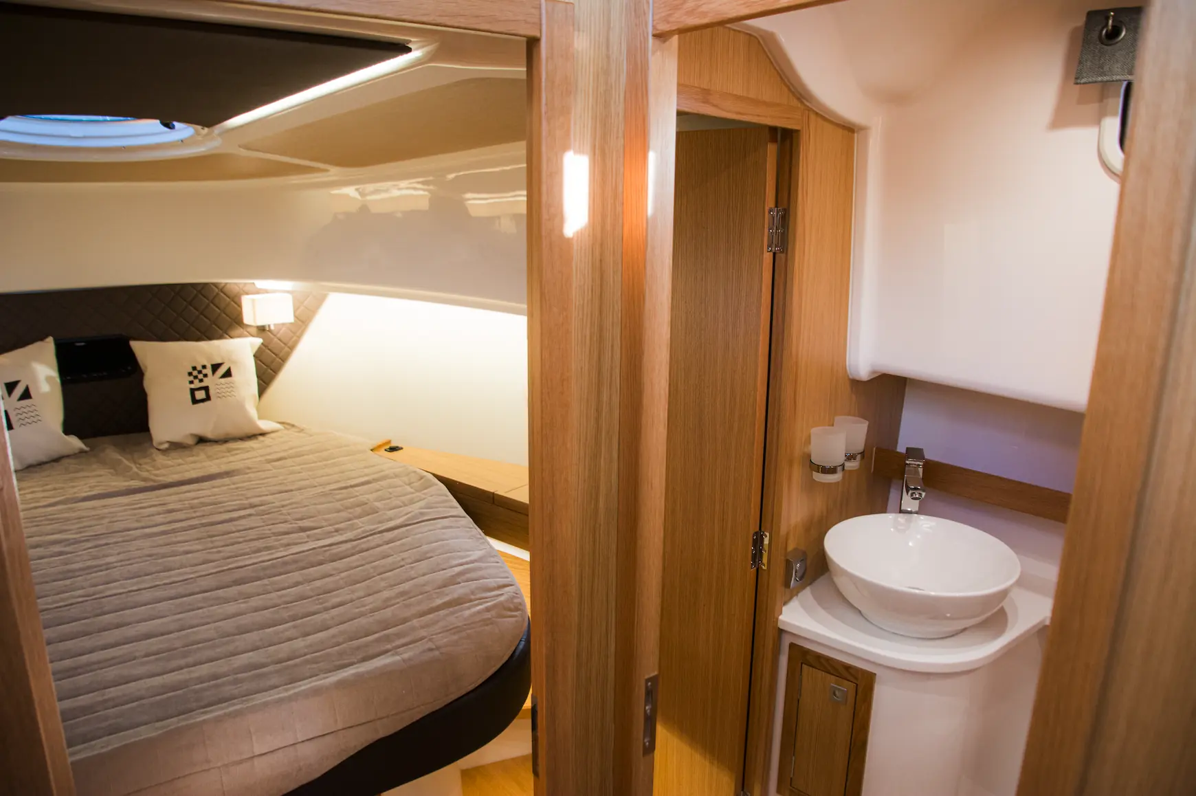 Med Nord Star sin fornyelse av modellene er også interiøret jazzet opp med bedre bokomfort og mer påkostede materialvalg. Det kommer til syne i denne modellen, som har fått to romslige kabiner. Den fremste har tilknyttet bad med eget dusjrom, mens den andre har nedgang fra salongen og har eget toalettrom. Her er det også blitt vinduer i skrogsiden og to separate senger som kan gjøres om til dobbeltseng. Forut har lugaren dobbeltseng, god takhøyde og romfølelse, og både skrogvinduene og luken i taket kan åpnes for lufting.