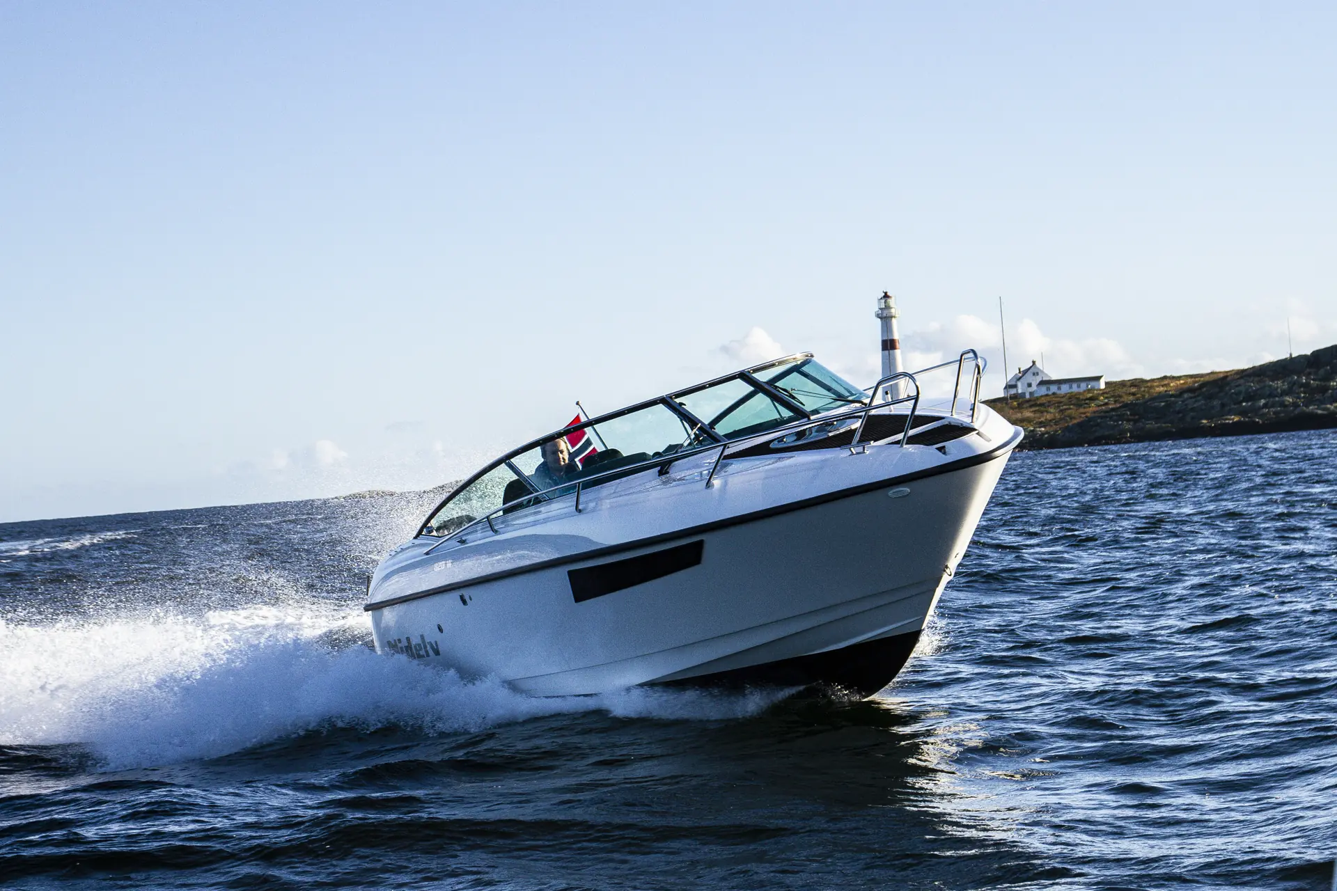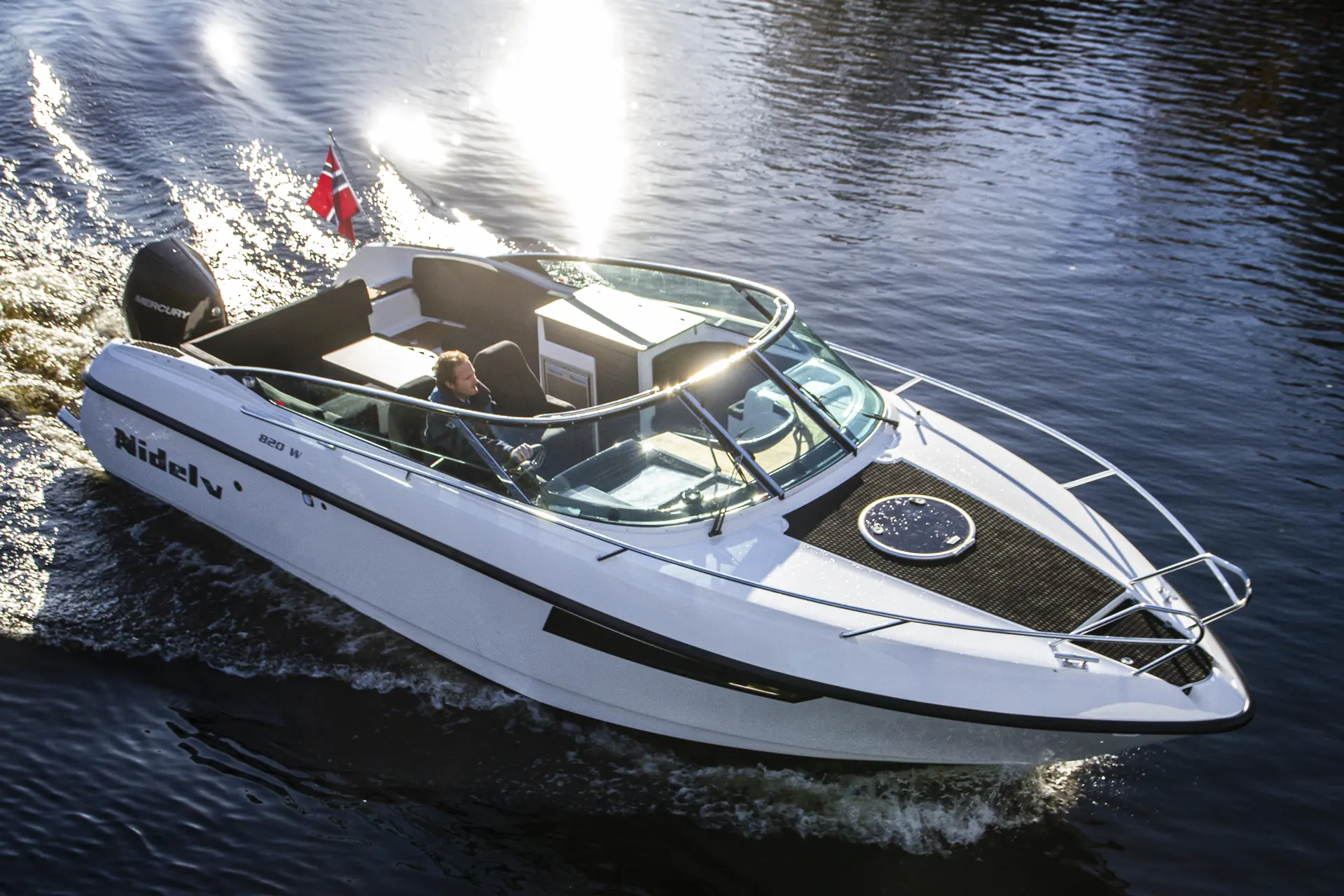 Nidelv 820W har et velprøvd og tradisjonelt v-bunnsskrog fra Nor-Dan Searider. Vår testbåt har Mercury 300 hk. på hekken, men du kan også få singel 400 hk. eller 2x250 hk. Vi måler toppfarten til førti knop med to personer og fulle tanker, noe som gir en marsfart på rundt tretti knop, og som vi vil tro holder for de fleste i målgruppen.
