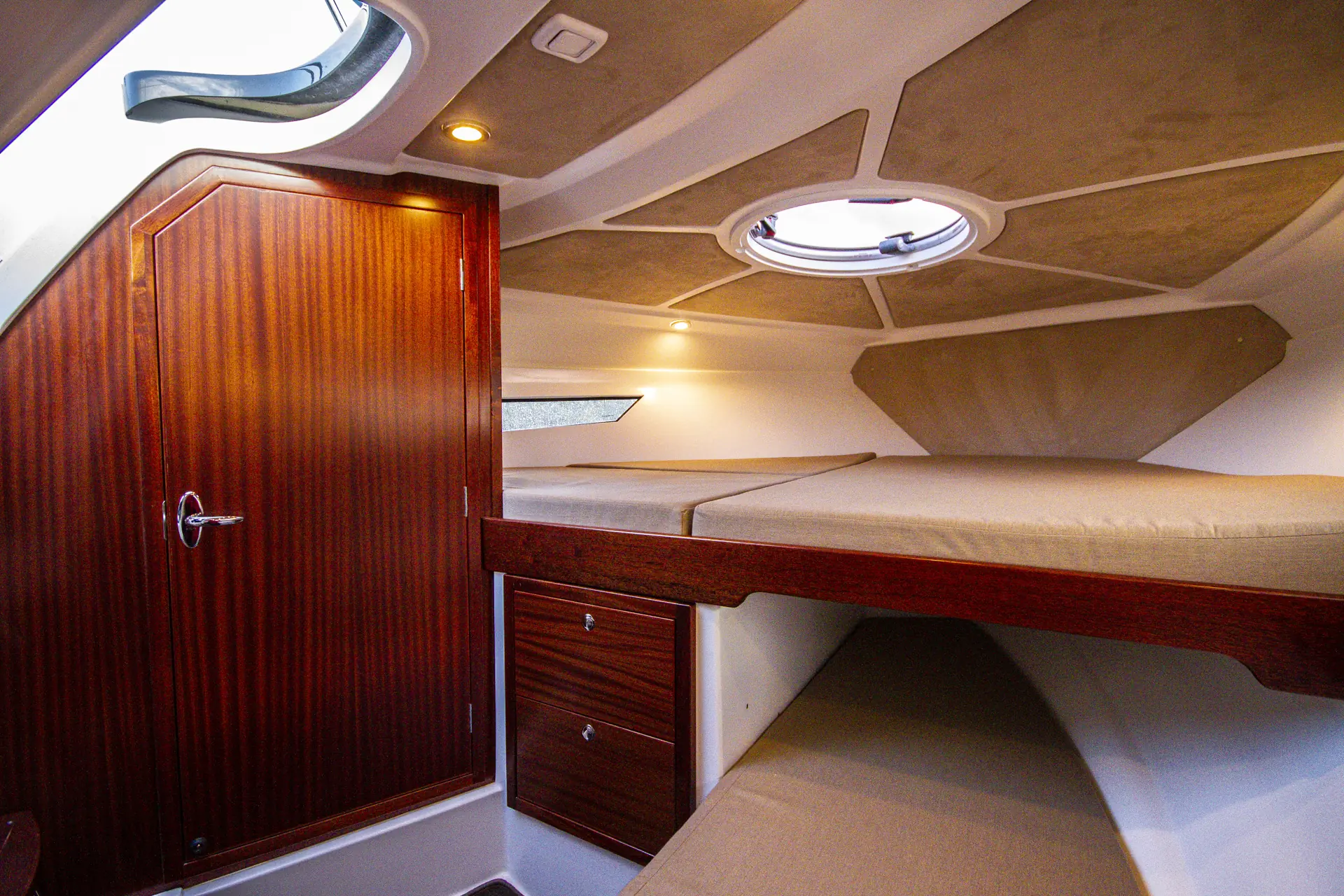 Under dekk leker Nidelv med myke stoffmaterialer og mahogni for å skape en lun atmosfære. Det er naturlig nok ikke ståhøyde her, men Nidelv har fått plass til en bred dobbeltseng forut og en lang stikkøye, som betyr at det er soveplass til to voksne og to barn. I tillegg kan selvsagt solsengen i cockpiten benyttes til soveplass for to personer om nødvendig. Toalettrommet nyter godt av det lange skrogvinduet, og er funksjonelt og enkelt innredet, og lett å holde rent. Det er ikke dusjmuligheter her, men som ekstrautstyr kan du få dusj på badeplattformen.