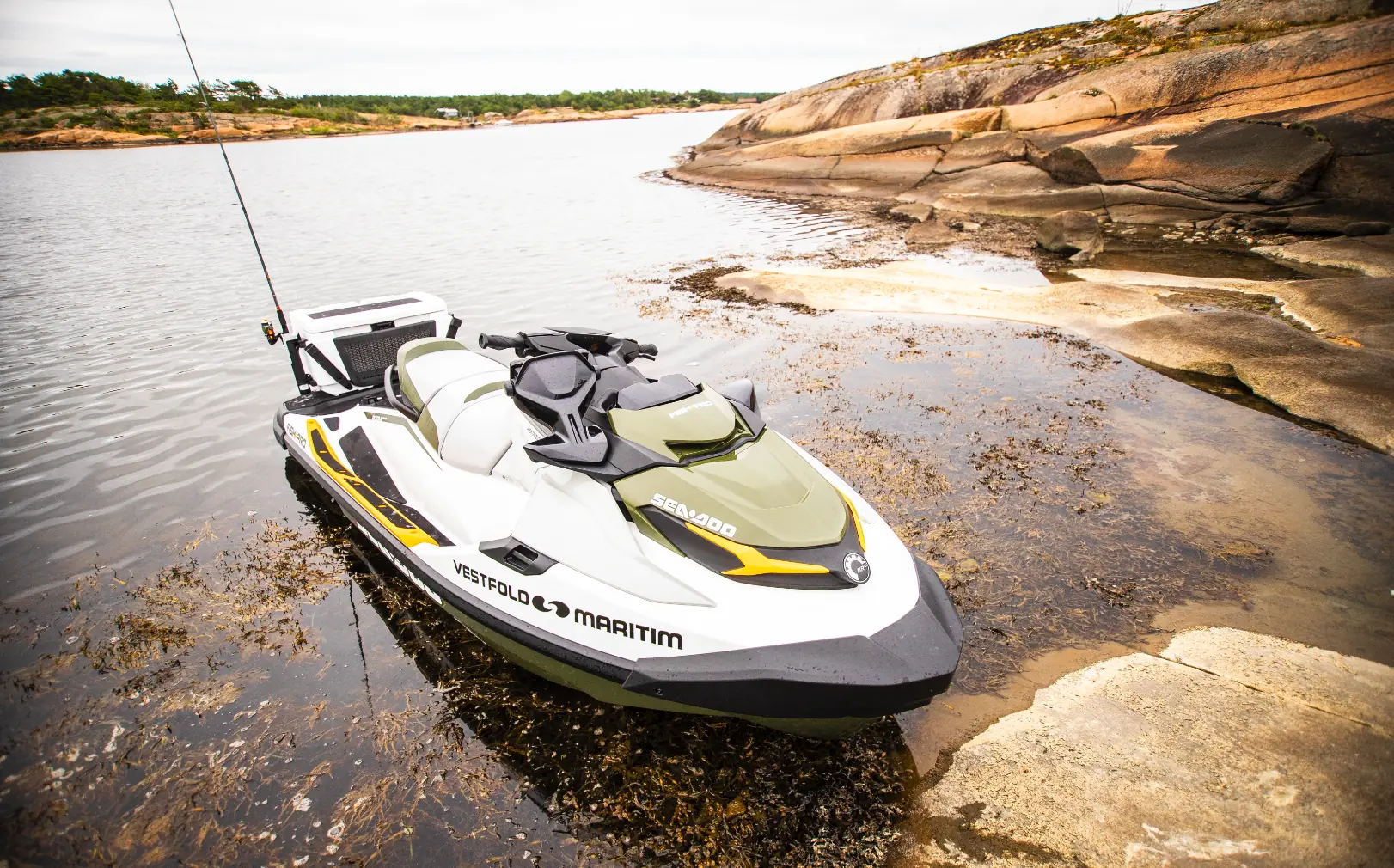 Fish Pro leveres blant annet med forlenget plattform bak for bedre stabilitet og oppbevaringsmuligheter, den har en 51-liters fiskekjøler med fire fiskestangholdere og skrå «fothvilere» for bedre stabilitet og sittestilling når du skal fiske fra siden. Disse tilpasningene bidrar til å gjøre vannscooteren både trygg og enkel å fiske fra – noe vi har testet ut selv. Fiskekassa kan enkelt tas av slik at du får en familiescooter som kan brukes til både utflukter, vannskikjøring og lek.