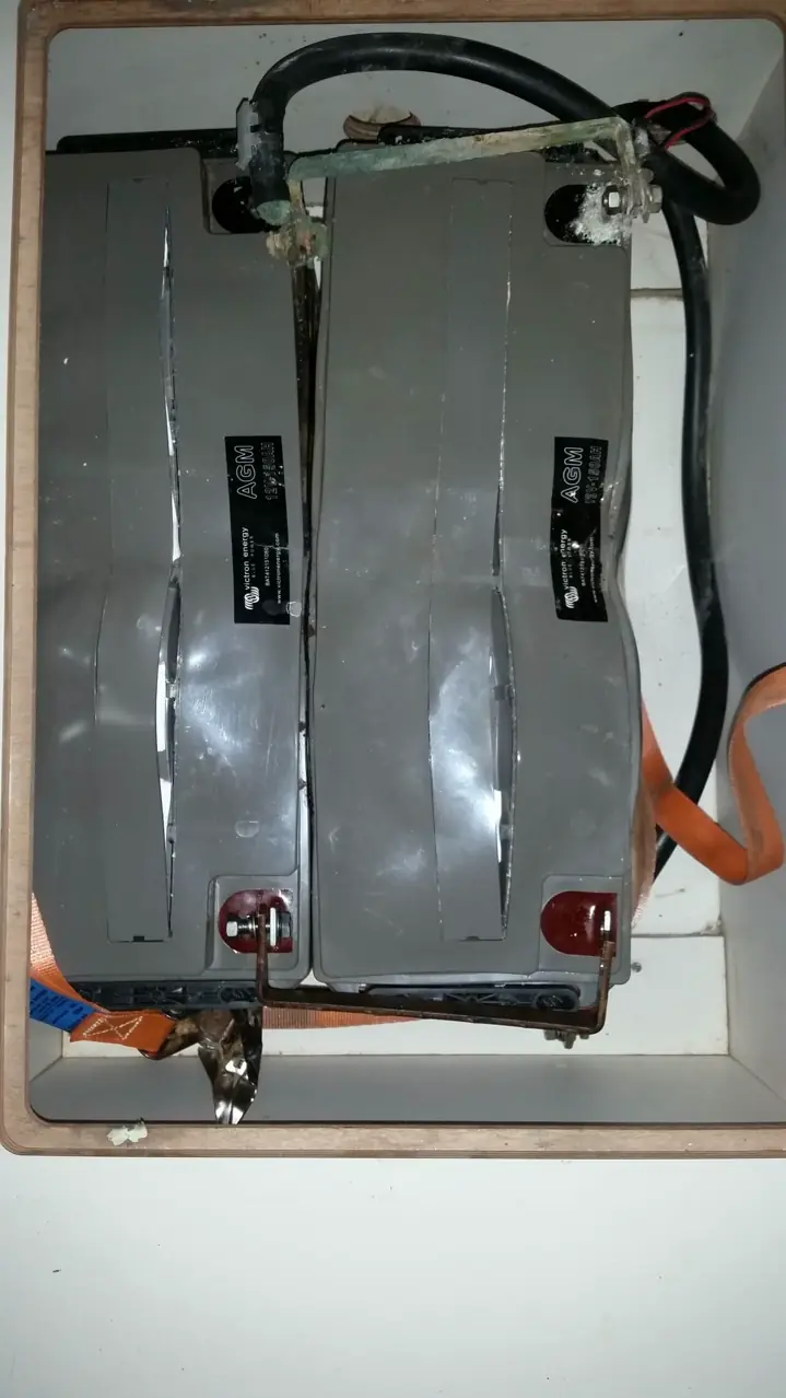 Eg var på veg til det lokale Volvo Penta verkstaden då Tom nemde, i ein bisetning, at kartplottaren hadde «blinka» då han prøvde å sette i gir. Kunne det vere eit straumproblem? Ingen av oss hadde så mykje erfaring med elektroniske gir. Bortsett frå Tom, då. Ganske riktig. Babord batteribank, halve forbrukskapasiteten på 300 amp, hadde regelrett eksplodert. Begge batteria var totalt deformert. Ikkje bra. Heller ikkje bra at batteria ligg under babord køy, i lugaren til Inger.