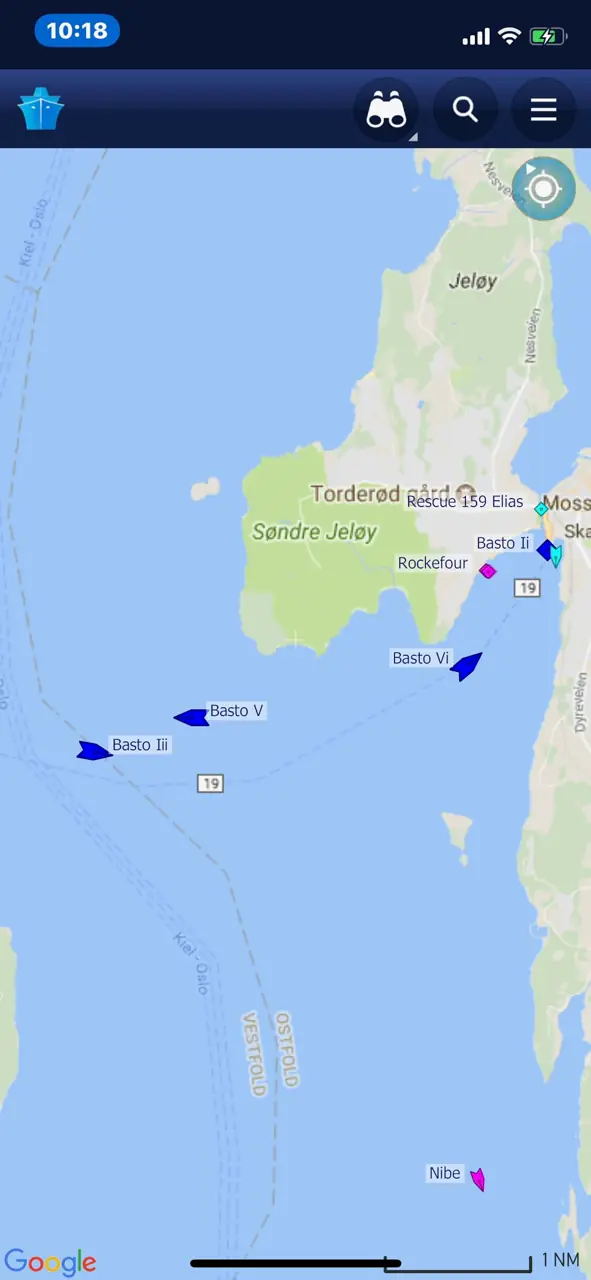 Godt hjelpemiddel: Kommer du nordfra og ligger i skyggen for ferjetrafikken mellom Moss og Horten er AIS et godt hjelpemiddel. Et eksempel på godt sjømannskap fra ferjene har jeg fra en påske vi kom fra nord. Tåka lå tykk og vi hadde kommet oss midt i Gullholmsundet (det lille sundet midt i bildet) da vi ble kalt opp på kanal 19 av en av ferjene som gikk ut fra Moss og spurte hvor vi skulle gå. Vi fortalte at vi var to båter på vei mot Fuglevik (rett syd for Moss). Vi fikk beskjed å holde kurs og fart og han ville avvente oss. Han hadde da observert oss på AISen før vi kom inn i radarsonen hans. Et godt tips når du er i Oslofjorden er å lytte 16/19. Kanal 19 er arbeidskanalen til trafikksentralen i Horten og der all nyttetrafikken opererer.