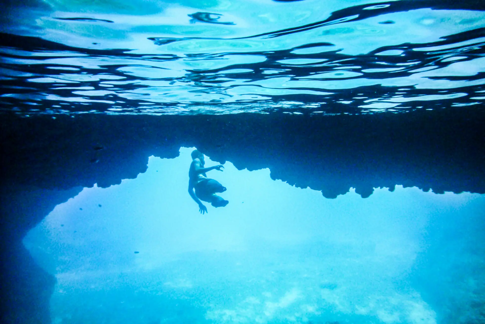 Etter seks timer(!) kom vi endelig fram – takket være en livat fyr som geleidet oss barbent gjennom jungelen og foret oss med appelsiner og papaya. Landeieren utstyrte oss med snorkel og dykkermaske, og til tross for lavvann stod vannet ved inngangen høyt. Eneste vei inn var å dykke gjennom det store, svarte hullet i fjellet som kunne skimtes under vannskorpa. Vel inne tok synet pusten fra oss. Sollyset falt inn gjennom et hull i taket og lyste opp inngangen i en dyp blå nyanse. Refleksene danset på veggene mens vi svømte og dykket i det underjordiske slottet. Stedet føltes like magisk som utenomjordisk.