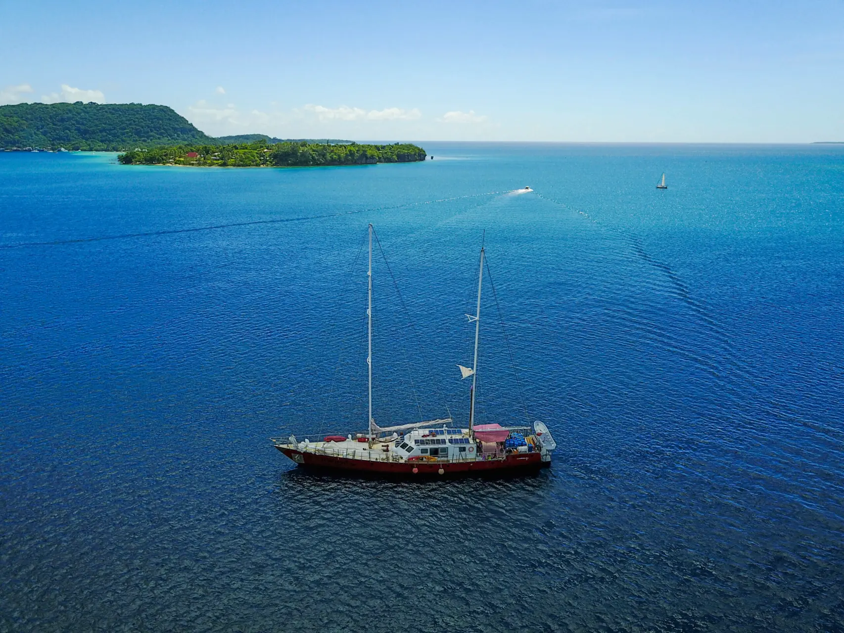 Etter et par-tre andre stopp var det på tide å sette kursen tilbake til Port Vila, hvor vi først måtte runde «Devil’s Point». Ved dette utsatte hjørnet av Øya Efate går vinden og bølgene mot strømmen, noe som danner ytterst ubehagelige seilforhold. Vi fikk erfare at det definitivt ligger noe i navnet. Etter ha prøvd oss på kombinasjonen stagseil og første rev i storseilet måtte vi innse at det til og med i ly av øya ble i meste laget. Ergo måtte vi på banen med nest minste fokkseil. Med storseilskøyta i hånda, forberedt på å slippe når som helst, kom vi klar av odden.