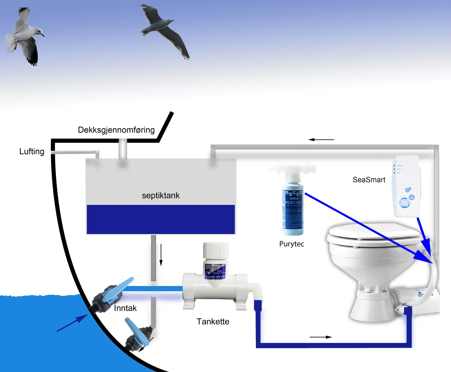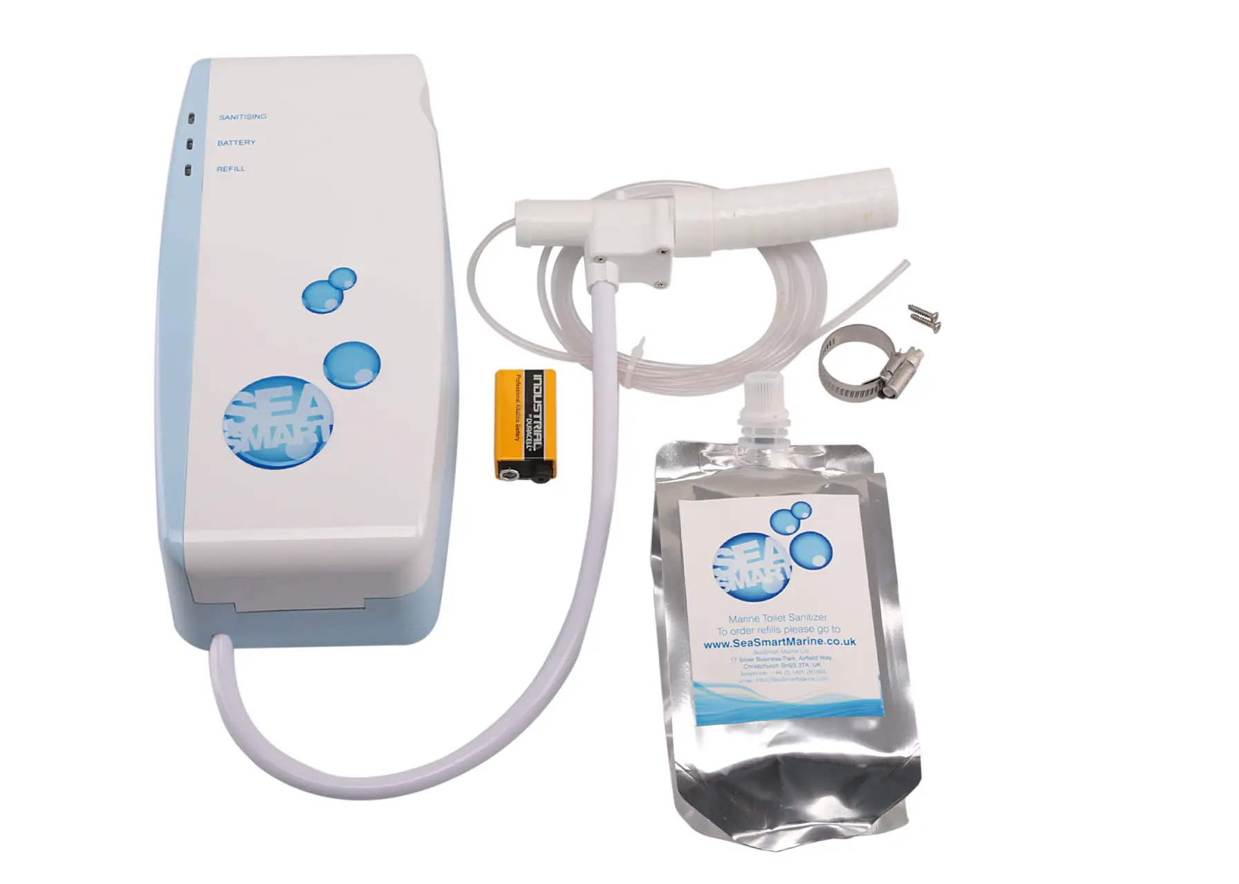 SeaSmart har et lignende system, som også er svært enkelt å montere. Her monteres en beholder med refill på skottet ved toalettet. SeaSmart doserer så passelig mengde med blå santitærvæske direkte i inntaket på toalettet, enten det er manuelt eller elektrisk. Slik rengjør og desinfiseres hele toalettsystemet. Avhengig av hvor mye toalettet brukes, holder normalt en refil 3-6 måneder. Det er enkelt å bytte den. Doseringspumpen drives at et 9 volt «røykvarslerbatteri», og kobles ikke til båtens elektriske anlegg. Montering av systemet er enkelt og krever ingen spesiell kompetanse. De to andre systemene har vi testet, men vi har ennå ikke fått anledning til å prøve ut SeaSmart-systemet. Pris hos Seatronic er normalt kr 1 899,-. For tiden på tilbud til kr 1 399,-. Refil koster kr 339,-.