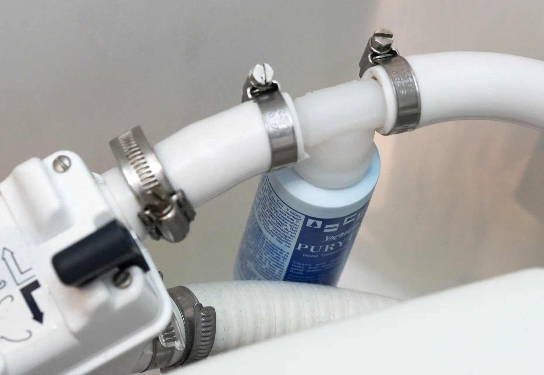 Enda enklere å montere er Purytec, settes rett på slangen til toalettpumpen – altså mellom pumpen og toalettskålen. Monteringen er uhyre enkel, vi brukte bare cirka fem minutter på hele arbeidet. Settet, som ikke koster mer enn 299,- kroner hos Maritim, inneholder en liten flaske med desinfeksjonsmiddel, T-stykke med slangetilkoblinger og pakning. I følge produsenten skal en flaske holde til cirka 400 skyllinger. Når det ikke lenger kommer blått vann i bollen bytter du bare ut refillen, som koster 169 kroner.