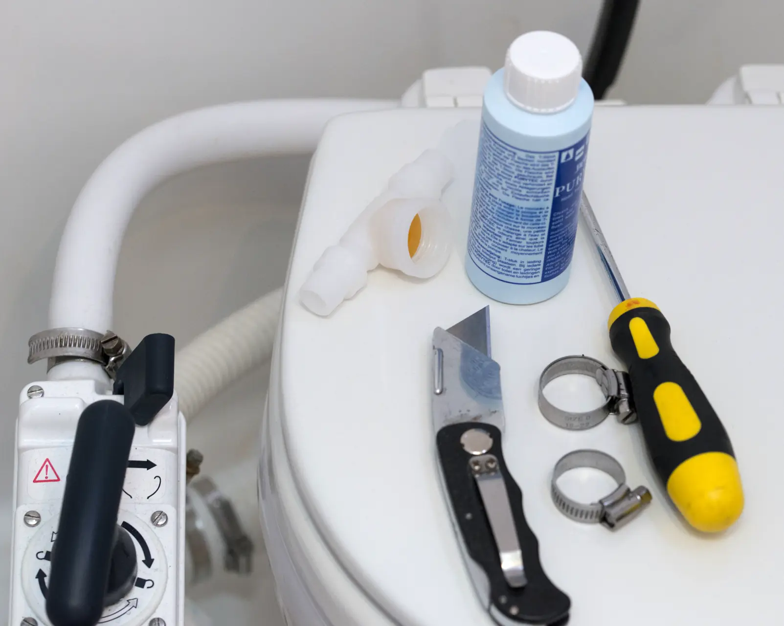 Dersom båten har toalettsystem med septikpumpe og eventuelt kvern, bør disse demonteres og gjøres skikkelig ren. Noe som kan være litt av en drittjobb. Rengjør impeller eller bytt den. Sjekk også elektriske koblinger og bytt koblinger som er dårlig. Dersom septiktanken har tankmåler med mekanisk giver kan det være lurt å også ta denne ut for skikkelig rengjøring. Mekaniske givere har en tendens til å henge seg opp med tiden, spesielt om de ikke vedlikeholdes.