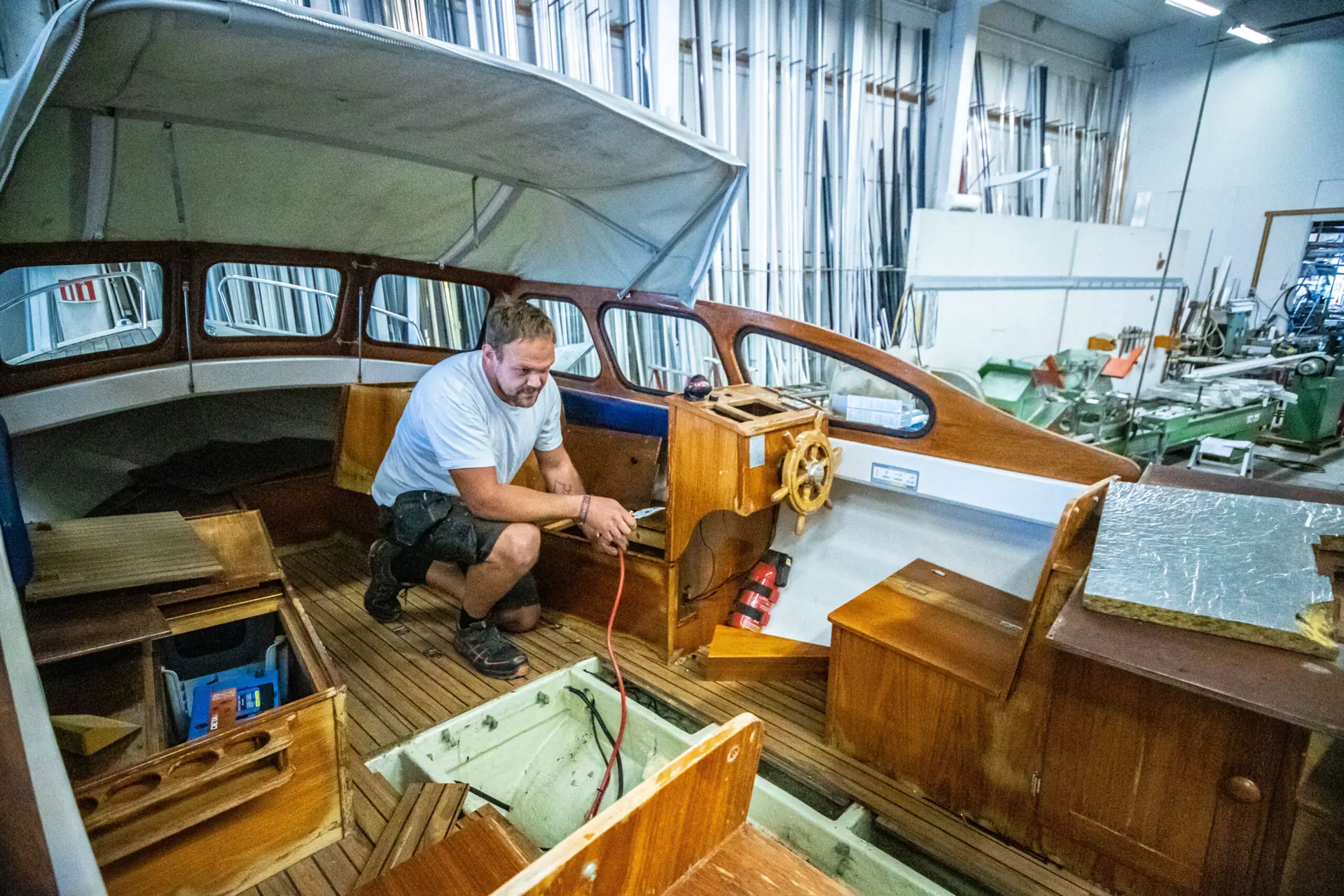 Kristoffer Clüver hos Green Waves tar på seg hele jobben. Ut går dieseltank, eksos, kjølevannssystem, motorinstrumenter, gass/gir og selve motoren – og inn kommer et elektrisk fremdriftssystem bestående av batterier, en distribusjonsblokk, en hovedsikring med hovedstrømsbryter og en elektromotor som er luftkjølt. I tillegg kommer digitale motordata med blant annet spenning, strømkapasitet og forbruk. – Vi tar ofte ut 500 kilo og setter inn 200 kilo, forteller Clüver.