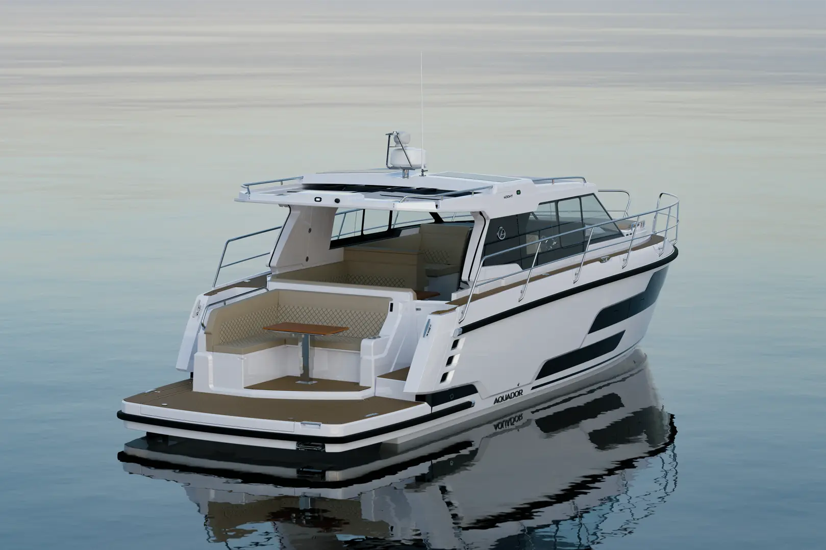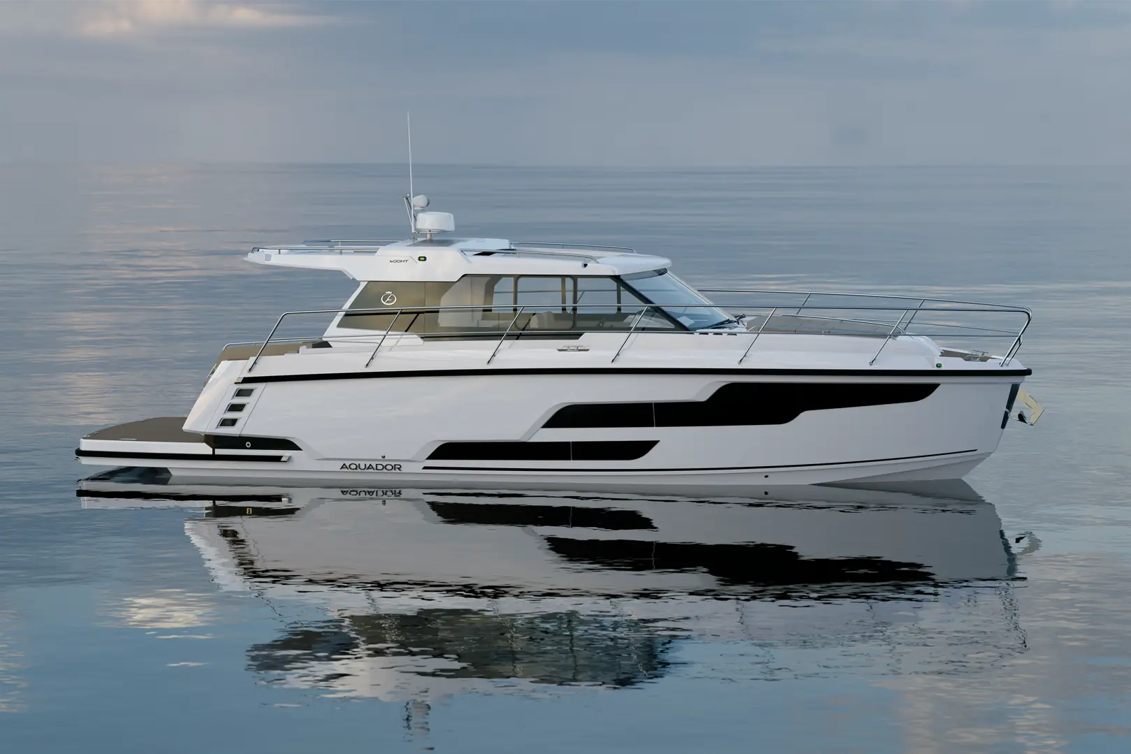 Aquador 400 HT byr på tre kabiner og åtte sengeplasser salongen medregnet, sammen med det som presenteres som romslige, sosiale soner. Legg for eksempel merke til salongen ved badeplattformen. Interessant å merke seg er at selv denne 40-foteren enten leveres med innenbords- eller utenbords motorer: