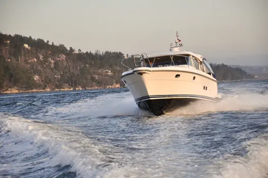 Når du skal svinge, så planlegg svingen – og husk å ta en kikk bakover. Båten må være stabilisert og ikke «fly» med høy motortrim. Dra av gassen eller trim litt inn. I sving bør du ikke trimme helt inn – det kan være skummelt da du får for mye baug i sjøen som kan grave seg ned og gi en hard sving eller en tverr.