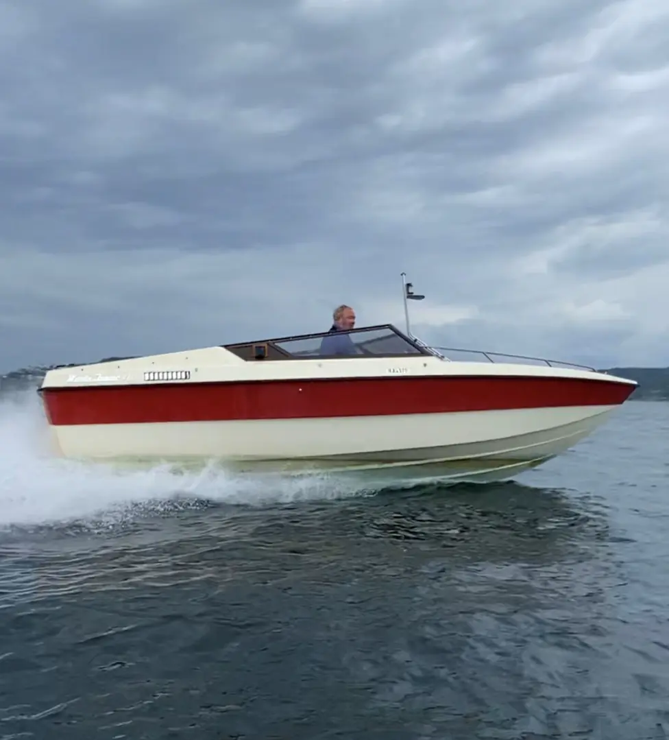 – Min yngste sønn og jeg kjørte båten fra Oslo til Risør med motorhavari underveis. Vi klarte å få start på den igjen i Tønsberg og karret oss til Risør der ny motor ble innkjøpt og gode kamerater hjalp til med motorbytte. Motoren er en Chevrolet 350 som skal gi en toppfart på cirka 44 knop.