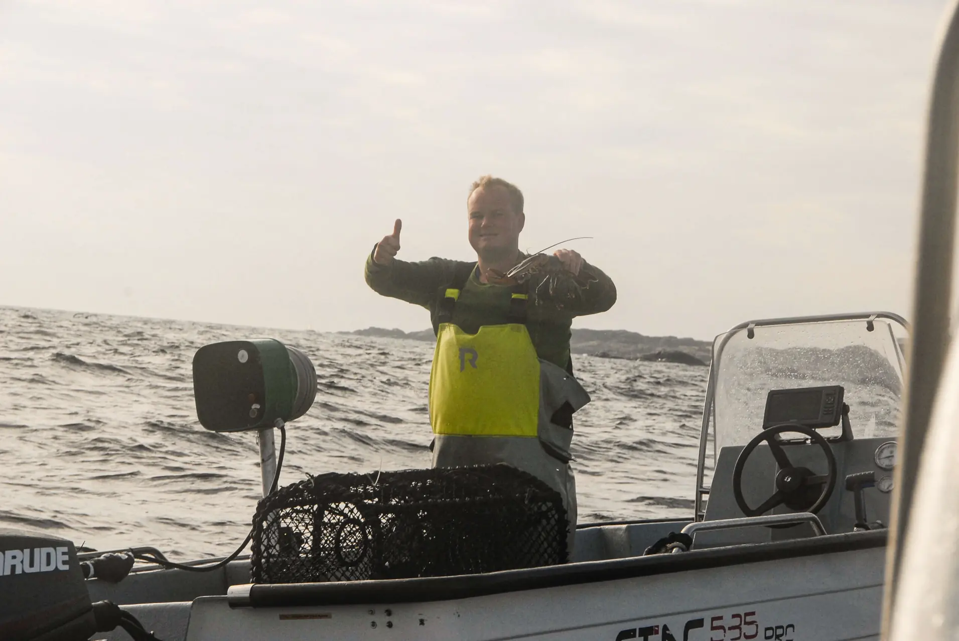 Teina vippes inn i båten, og der ligger det en pen hummer. Svein måler den ikke. Han trenger ikke det, han ser at fangsten er mellom 25 og 32 cm, lovlig, altså. Dette kan han!