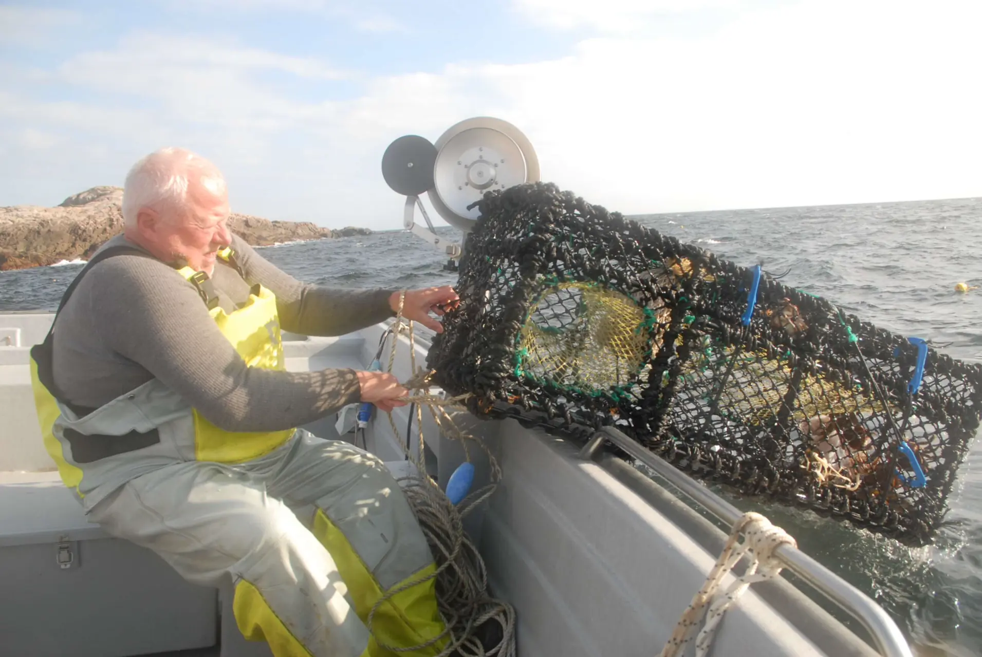 Svein har tro på ei havteine som står fint til, men den veier over 30 kg, så her er teinehaleren god å ha. Ingen hummer, men en del krabber og en illsint, liten breiflabb. Gammelt agn kastes ut og nytt agn puttes inn i agnposene. Måkene har et støyende festmåltid rundt båten.