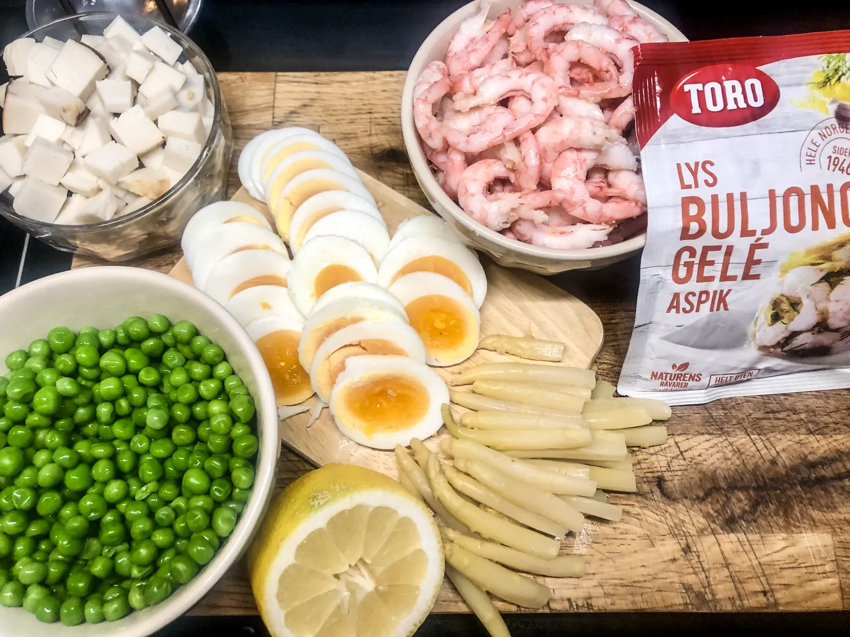 Lag aspiken etter anvisningen på posen. Hardkok eggene og del med eggedeler. Legg et lag med reker og erter, gjerne i et fint mønster, i bunnen av formen. Jeg lager i tillegg et lag med eggeskiver langs kanten. Hell et tynt lag med aspik over og sett formen kjølig til geléen stivner. Fyll deretter formen lagvis med de andre ingrediensene. Sett kjølig til aspiken stivner. Dette tar minst 2 timer, så lag den gjerne dagen før den skal serveres. Med en tynn kniv løsner du kabareten fra sidekantene. For at kabareten lett skal slippe formen, dypper du den et par sekunder i varmt vann i oppvaskkummen. Ikke lenger, det er bare det ytterste laget av gelatinen som skal smelte såvidt, slik at kabareten løsner.