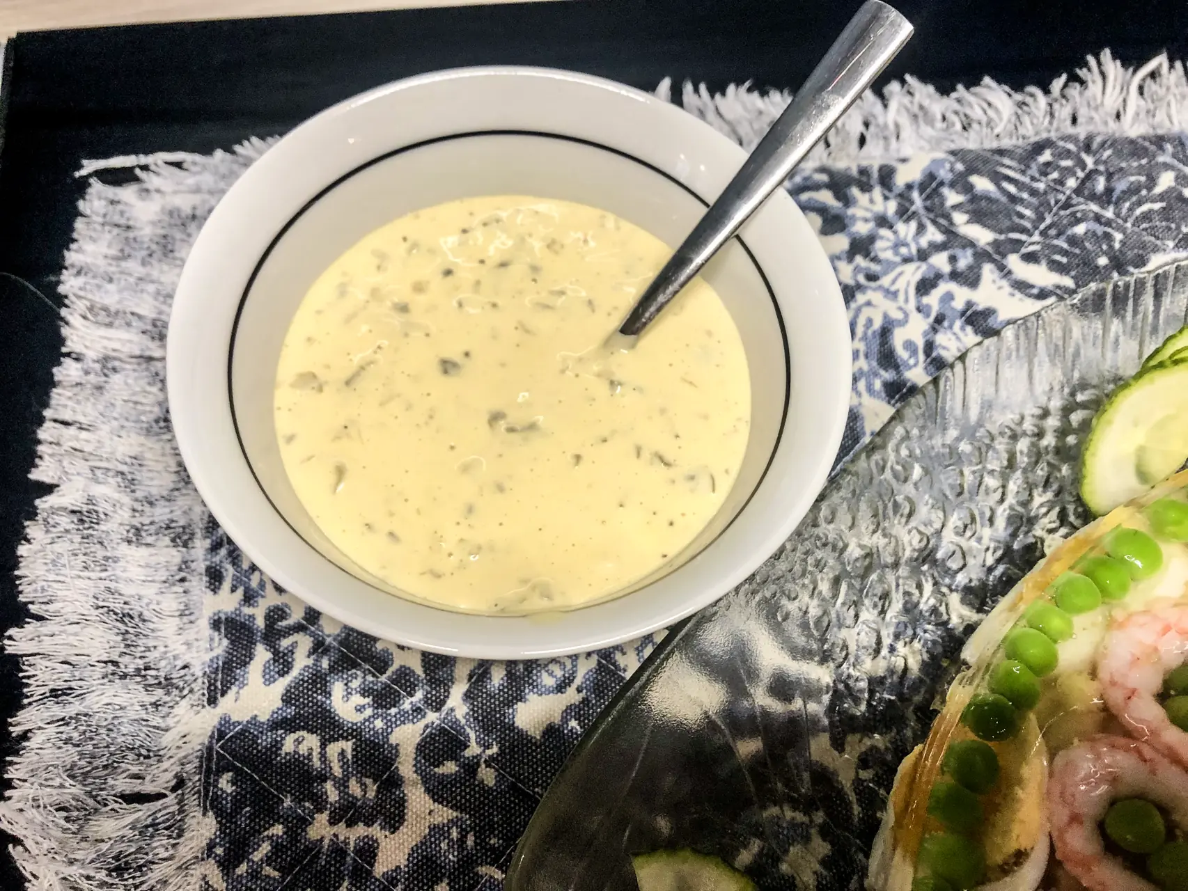 Bland majones, crème fraîche og sennep. Tilsett finhakket kapers, sylteagurk og bladpersille. Smak til med salt og pepper.