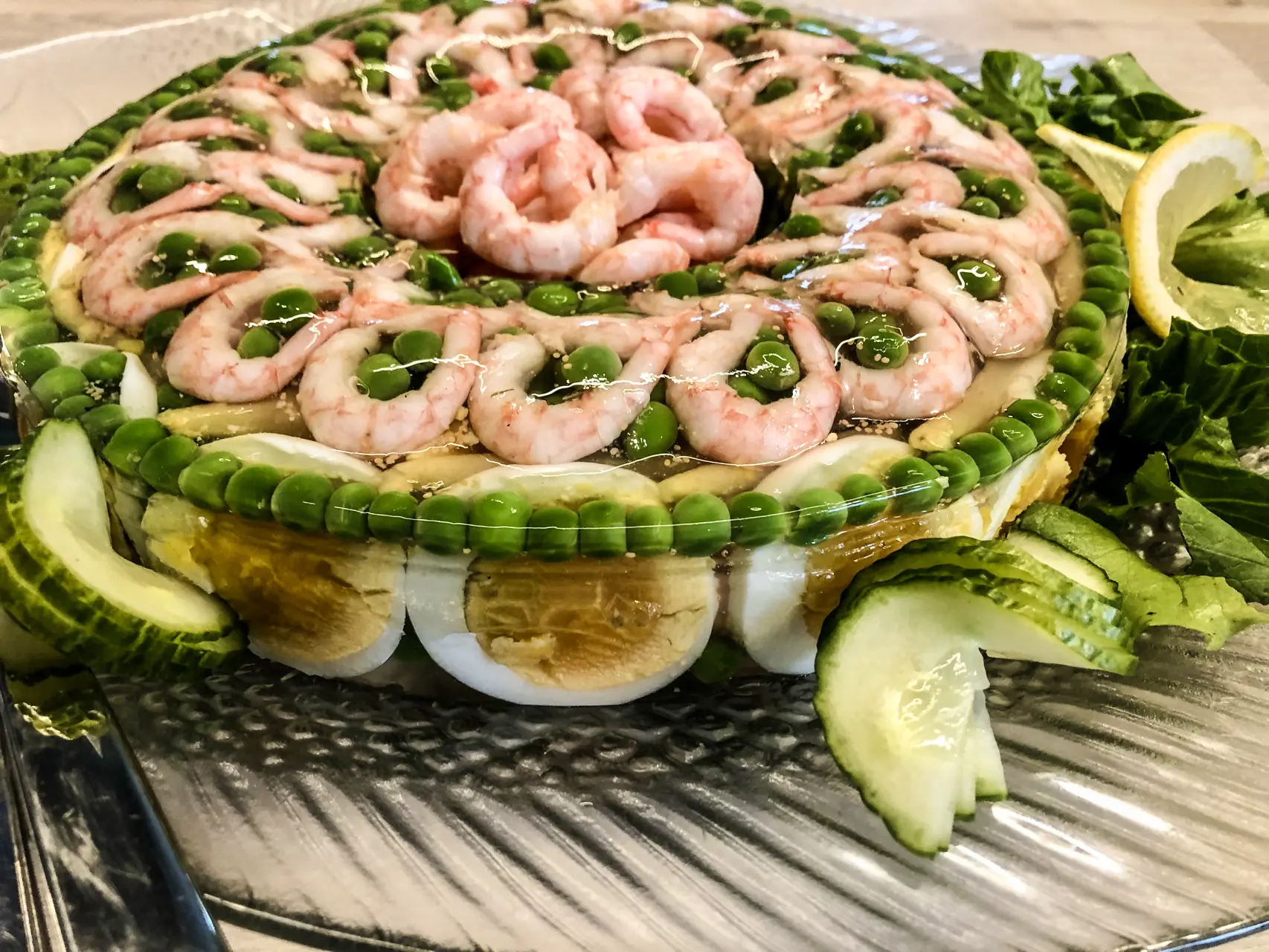 Retten kan bestå av aspik, en gelé laget av kraft, med reker/skalldyr og fisk/fiskepudding eller en kjøttvariant med skinke eller kylling. I tillegg skal den inneholde grønnsaker og egg. Varier gjerne med forskjellige skalldyr om du lager sjømatvarianten. Lager du kabareten med kjøtt, bruk gjerne mørk aspik.