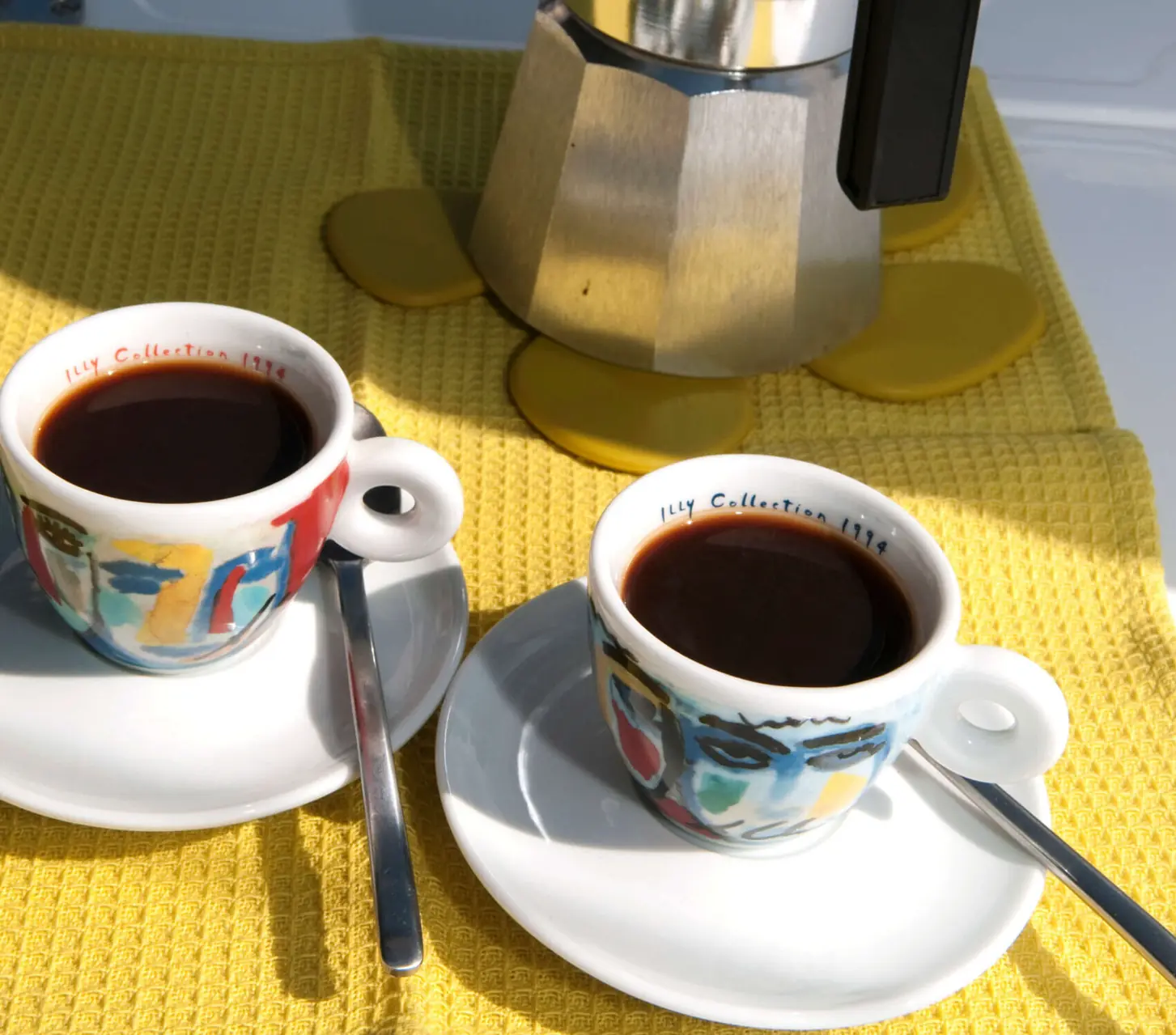 Ønsker du å bråvåkne er det ingen ting som en sterk espresso – svart som ravnens skygge. Vi begynner ofte dagen med en slik – helst inntatt på dekk. Bruk gjerne en klassisk mokkakanne (etter den jemenittiske byen Mocha). Dette er en kanne med to kamre og kan brukes på gassbluss. Passer den ikke på ditt bluss kan du lage en liten rist den kan stå på. I den nederste delen blir vannet varmet opp slik at det presses oppover, gjennom den og over i en beholder som ligger over. Når kaffen kommer frem her er den ferdig. Bruk espressokaffe, som er finmalt og sterk. Serveres i små kopper, gjerne med litt brunt sukker til. Kannen får du for et par hundrelapper. Espressokaffe kan også brukes til forskjellige trendy kaffedrikke, som «latte» og cappuccino.