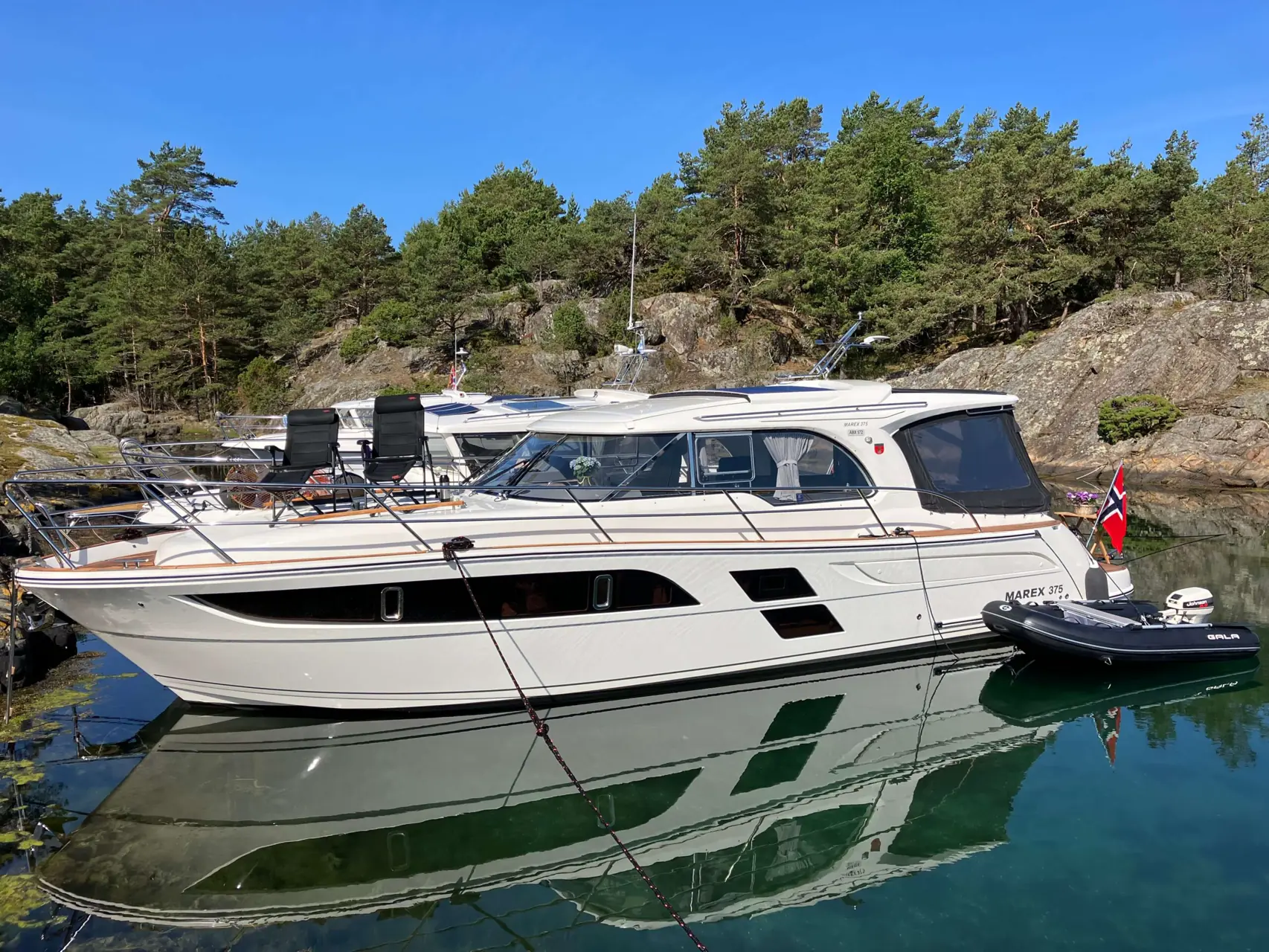 – Sommeren 2020 hadde vi gjort båten ferieklar, og Tom skulle inn til Leangbukta for å få tak i nye batterier. Da kom han i kontakt med Atle hos Marex. Vi hadde lenge drømt om Marex 375, men ville ha båten med aksling. Tilfeldighetene skulle ha det til at det sto en leveringsklar 375 med nettopp strak aksel hos forhandleren. Tom kom hjem med nye batterier til glede for ny eier av Nidelv 320, og med en splitter ny 40-foter, forteller Karin.