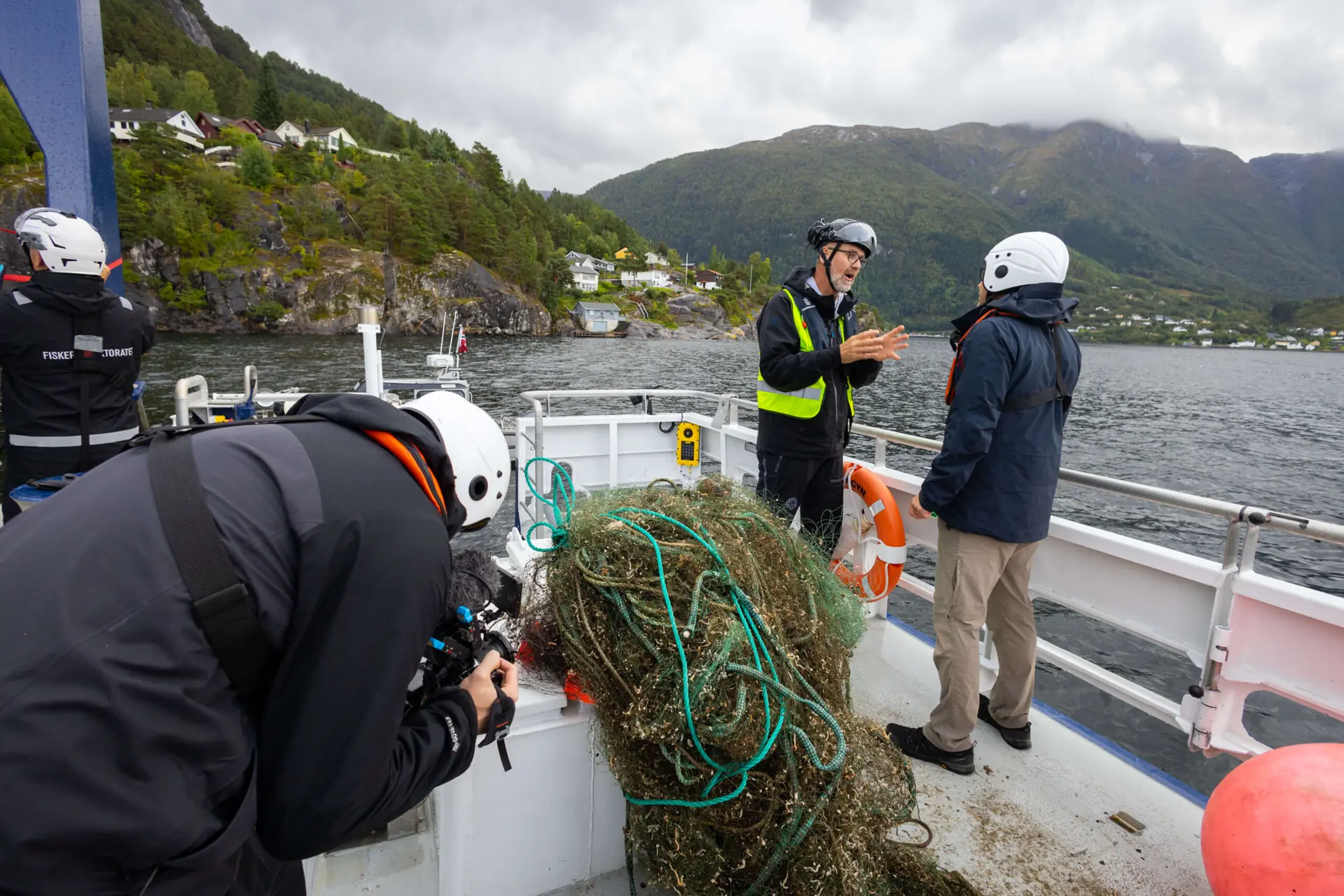 Knut Arild Hareide kommer trippende bortover glatte bryggefjøler i dress og slips. Som direktør for Sjøfartsdirektoratet skal han om bord på Fiskeridirektoratets nyeste ryddebåt Fjordgyn for å se spøkelsesteiner fra Hardangerfjorden hentes opp fra sjøen. Kenneth hilser velkommen. Straks dreies praten inn mot marin forsøpling før en lenke med 20 leppefisketeiner lander på dekk. Hver teine inneholder levende småfisk, kreps, krabber, lange – og en i den ene – en åttearmet blekksprut. Alle artene vil dø om de om de ikke kommer seg ut derfra. Kenneth tar blekkspruten opp med hendene.