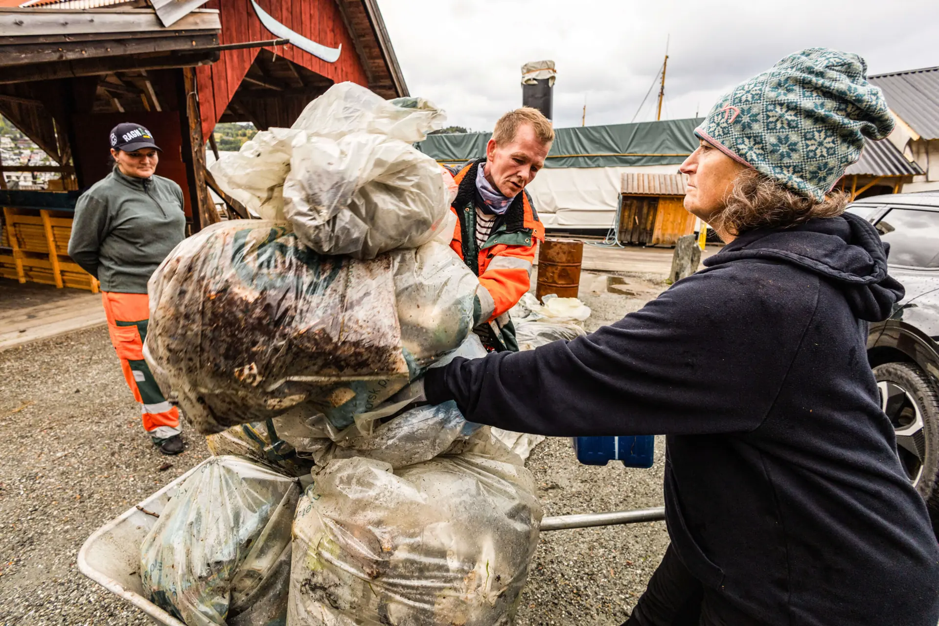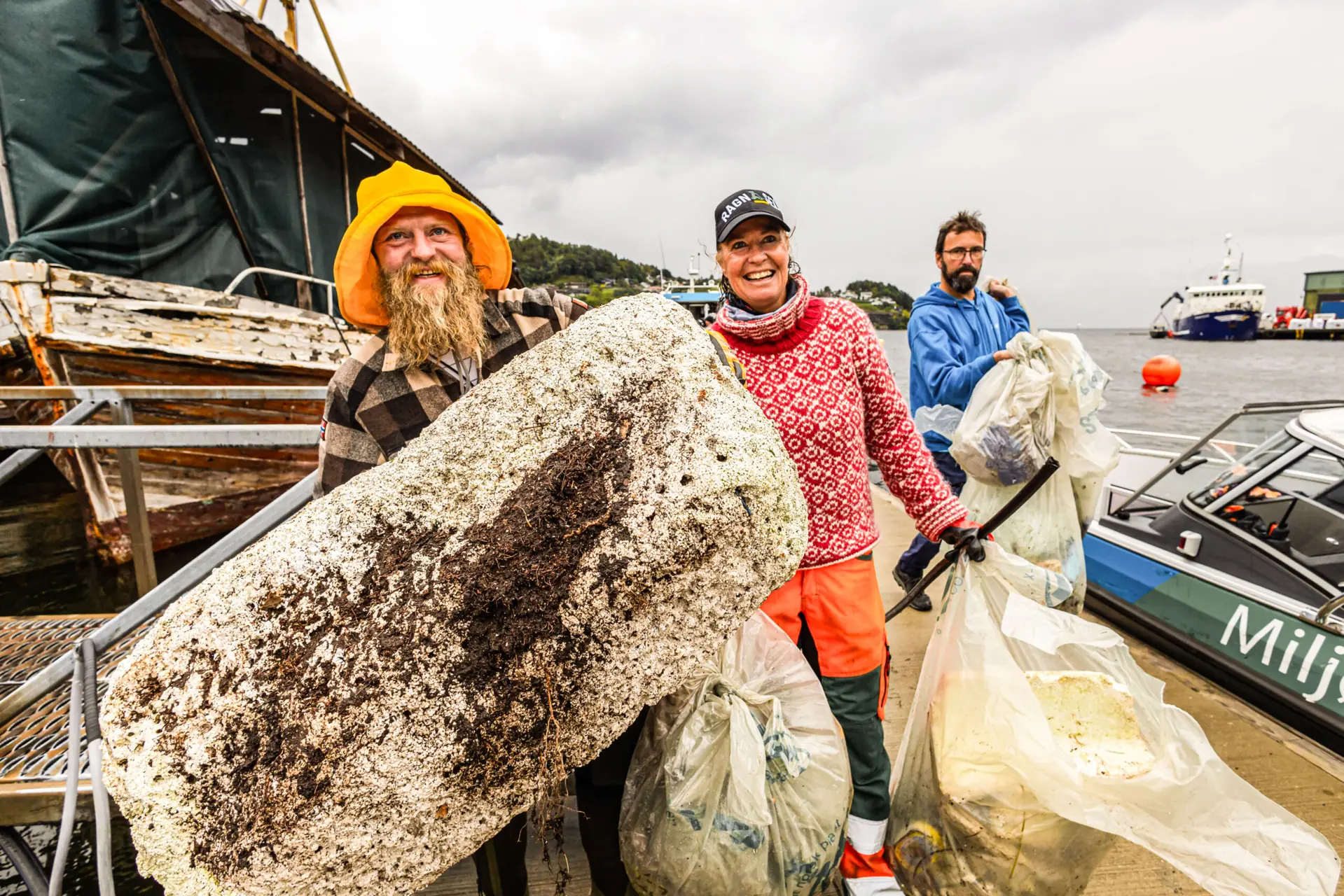 Frivillige strandryddere samles på bryggen i Norheimsund etter noen søkkvåte ryddetimer. Den ene bagen etter den andre med plast, tau, blåser, isopor og annet marint søppelknask samles på bryggen. Det viser seg at det er blitt ryddet 11 tonn på seks timer. I tillegg ble det ryddet fire tonn under vann, hovedsakelig garn og spøkelsesteiner.