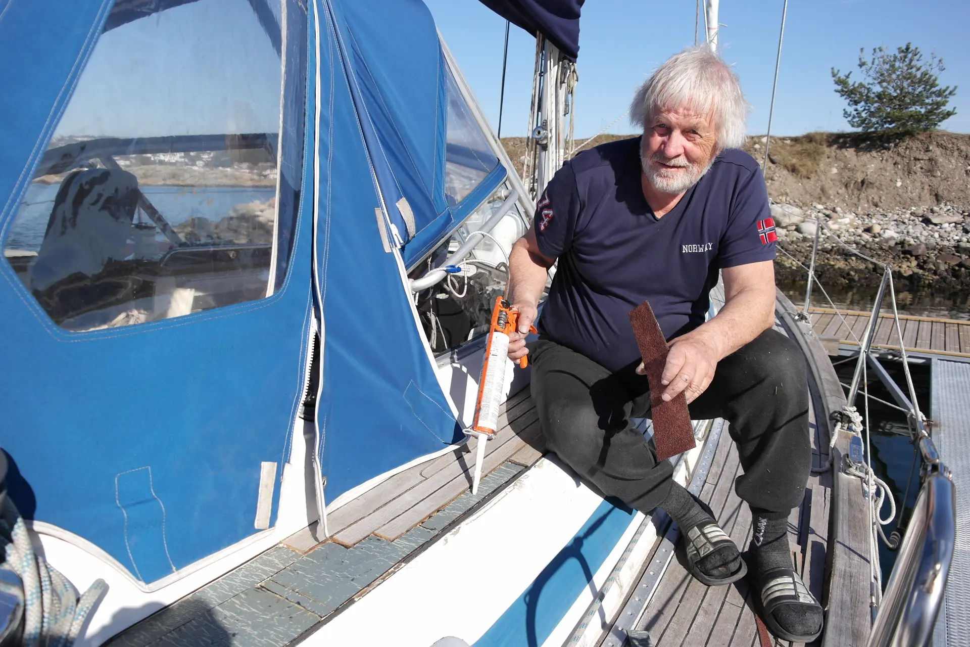 Flere steder har Svein måtte fjerne deler av teakdekket som hevet seg på grunn av utvidelse av fineren. Han erstattet fineren med shingel. Limte den uskadde teaken på dette.