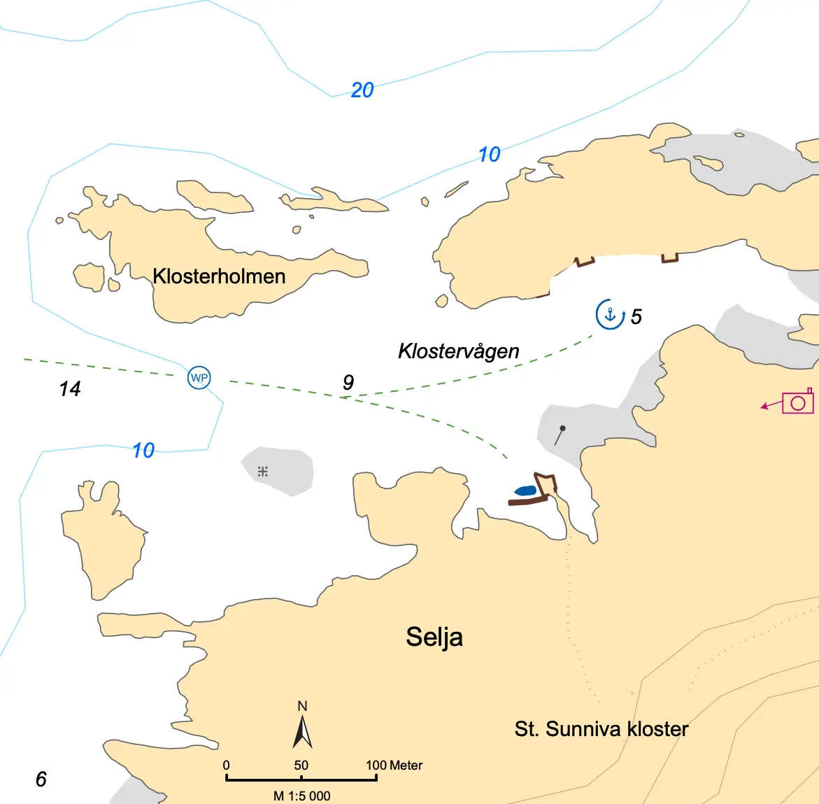Klostervågen ligger nordvest på Selja. Det er en flytebrygge i betong og en trekai nedenfor klosteret. Der kan vi fortøye longside eller med anker ute. Kaien ved siden av flytebryggen er til skyssbåten. Det er også mulig å ligge for anker nordøst i Klostervågen. Ankommer vi fra sør, går vi øst for Kjeholmen – og øst for 1,3 meters grunnen øst for denne – før vi tørner styrbord og går inn sør for Klosterholmen.