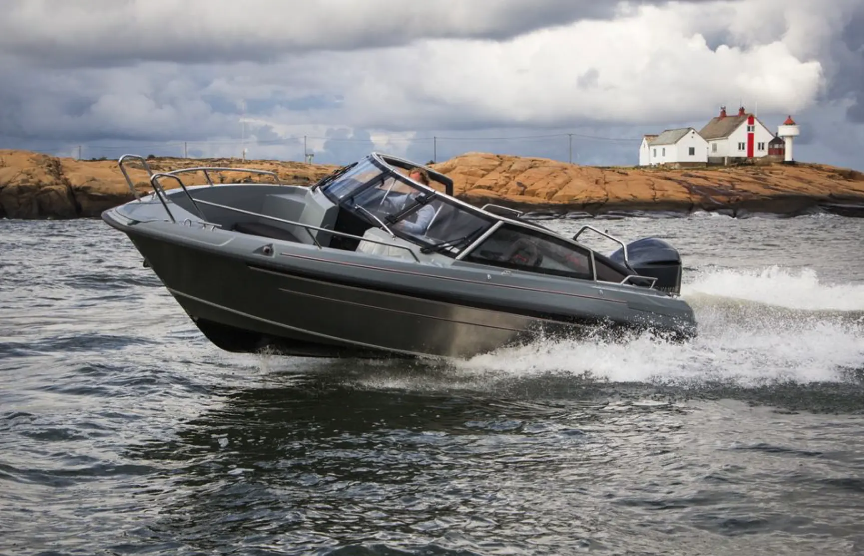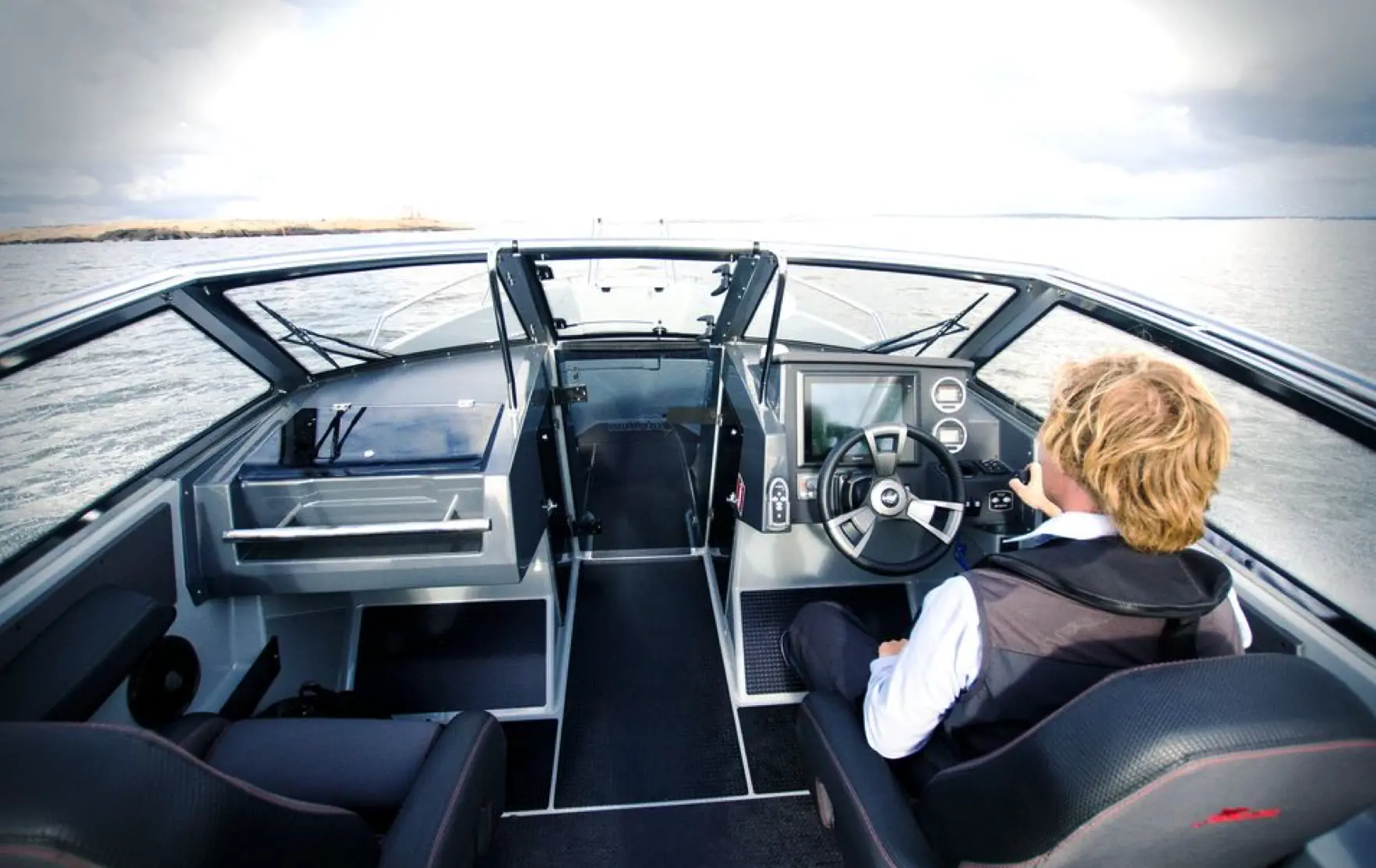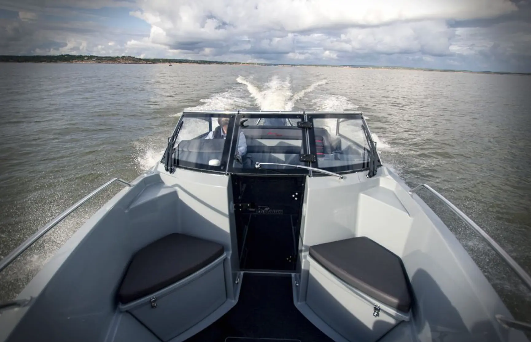 Det er komfortabelt å sitte akter selv når man kjører i fart og litt sjø, og takket være den store, markerte vindskjermen, sitter passasjerene lunt og beskyttet for mye vind. Enda bedre er det selvfølgelig å ta plass i to påkostede stolene i fartsretning. På babord side finner vi et vanntett og låsbart «hanskerom» for mobiltelefon, stereoanlegg og kameraer, og på begge sider er det fenderholdere for fire fendere. Førermiljøet er et av de beste vi har sett på denne størrelsen båt. Gass/gir sitter perfekt i hånden, det er eget armlene, også for co-føreren, og rattet kan justeres, akkurat som stolen også kan.