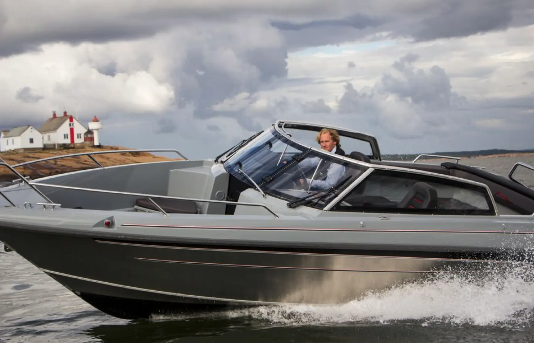 Båten oppleves som myk og komfortabel å kjøre selv når vi beveger oss opp mot tretti knop i litt sjø. Det slår ikke, vi sitter behagelig og det oppstår ikke noe uforutsett. Båten er forutsigbar i svinger, og vi kan trimme motoren en del ut i sving uten at den suger luft. Selv når vi går i sidesjø oppleves den som behagelig og tørr. Skroget sitter som støpt i sjøen. Vi må ta i bruk trimflapsene hvis en passasjer beveger seg under fart, men ut over det er det kun litt enkel trimming på motoren som må til. Vi finner oss raskt komfortable med å kjøre denne båten.
