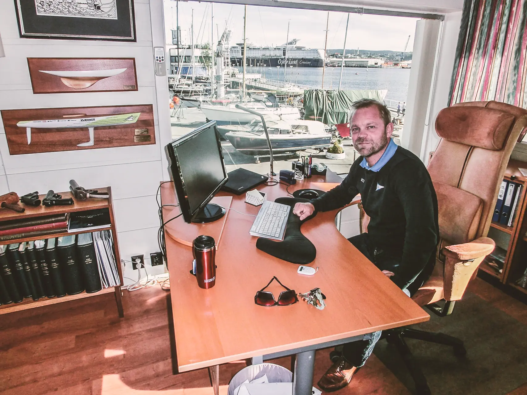 – Jeg har ikke rettet på noe her. Bare flagget fra KDY som jeg fikk i avskjedsgave har jeg hengt på veggen.