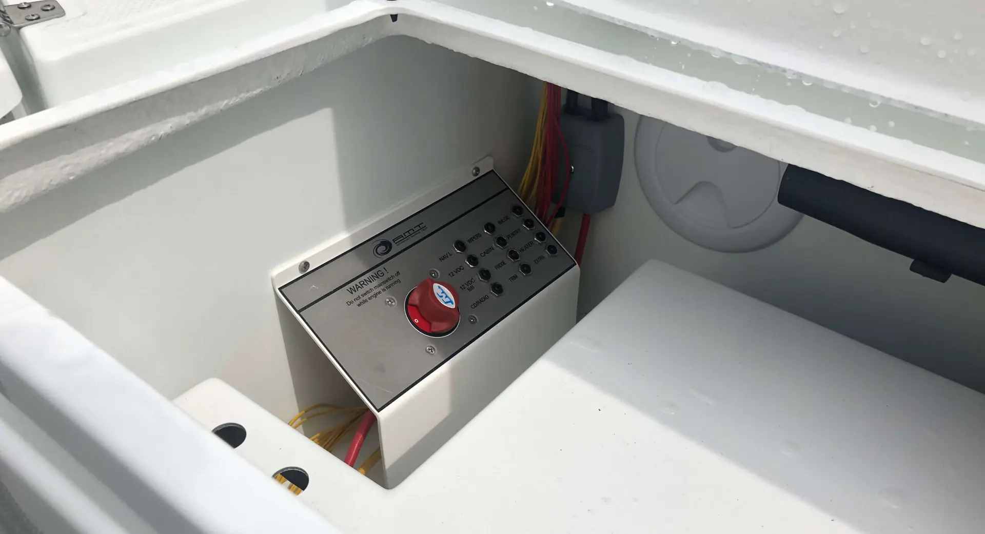 De fleste åpne båter har en dødmannsknapp. Det er denne røde snora som må festes i deg selv. Faller du over bord sørger den for at motoren stopper, og den må også være på plass for å få startet motoren.