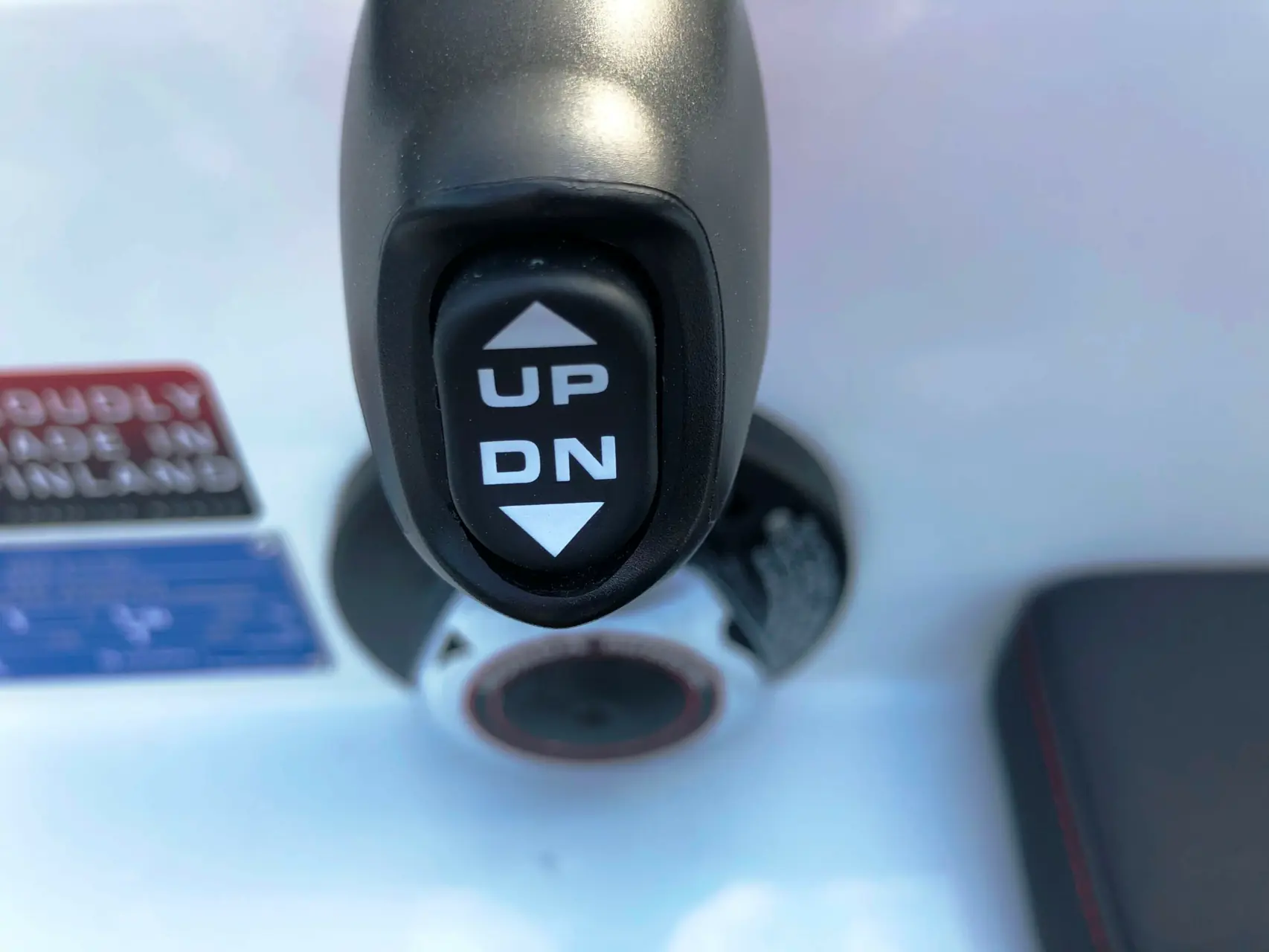 Nå kan vi tilte motoren ned i vannet og dermed beveger vi oss frem til førerposisjonen. Det gjør vi normalt på gasshendelen. Her er motortilten, og den bruker vi også for å – kort forklart – justere baugens høyde når vi kjører fort. På den måten får vi mindre våt flate og kjører mer drivstofføkonomisk. Så denne knappen er også helt sentral i båtkjøringen om du skal ligge i plan.
