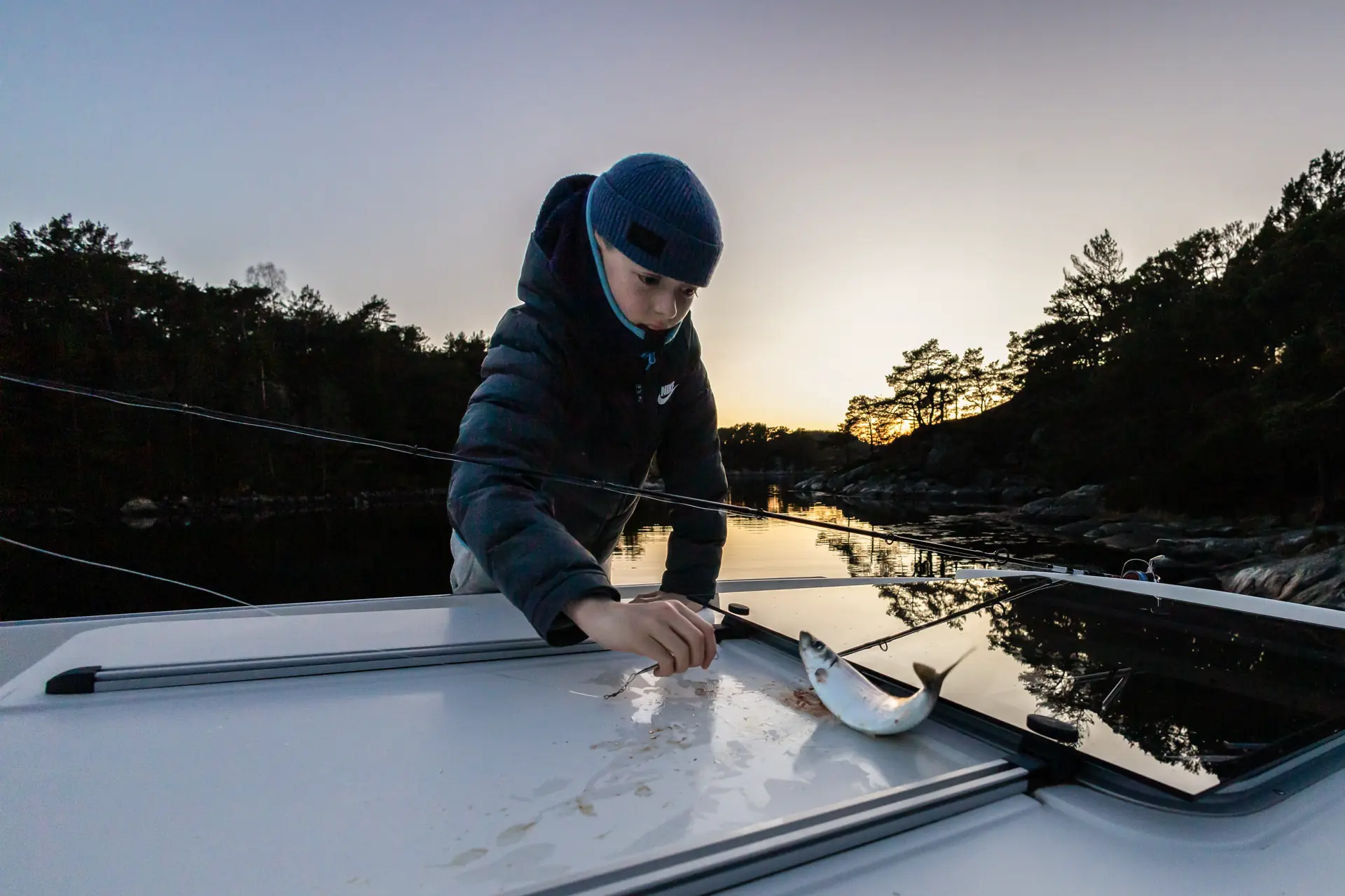 Jeg løsner kroken og kaster den tilbake til slektningene sine. Ikke ofte jeg praktiserer catch and relief, men i kveld skal vi bare slappe av og kose oss. Ikke styre på med fisk og slo.