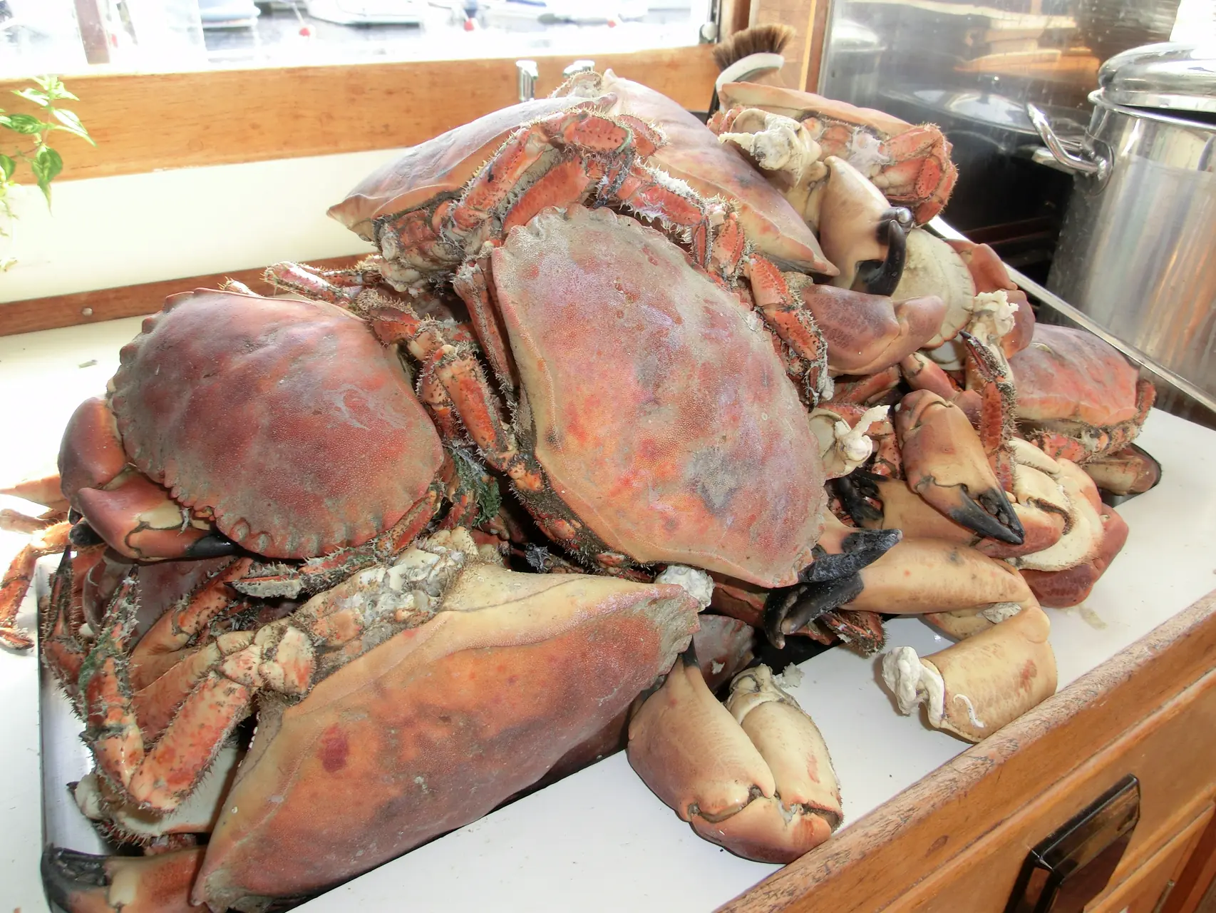 Vi har vært ute lenge. Manges øyne følger oss inn i havna. De som vet at vi skulle trekke garnet kommer bort og glor. Vi tilbyr dem å hjelpe å rense garnet mot å få de krabbene de tar ut. Fire timer tar det å få ut de 80 (!) store krabbene. I Båtens Verdens navn inviterer vi hele brygga på krabbefestlunsj.