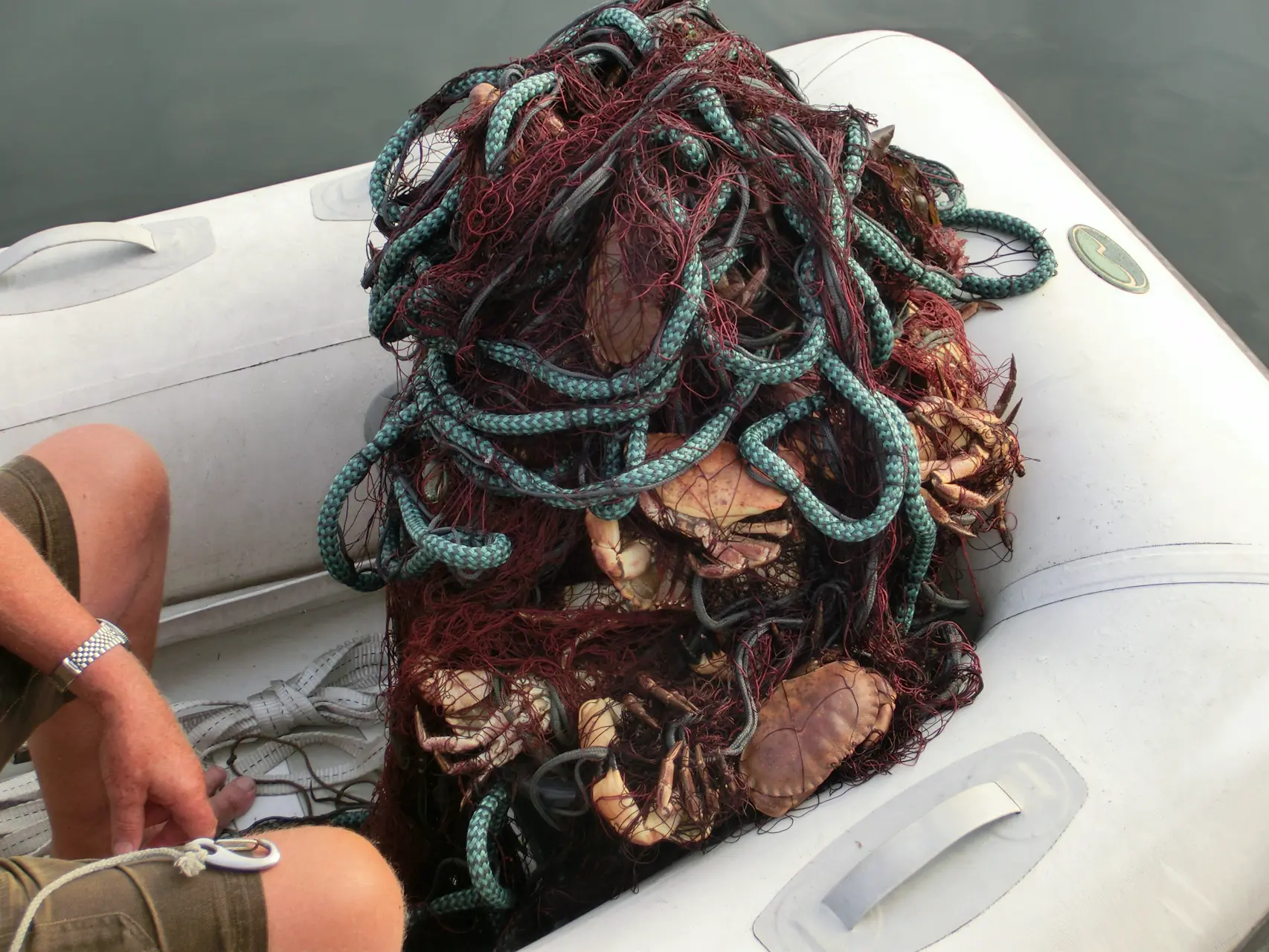 Garnet ligger der vi forlot det. Allerede, helt i begynnelsen ved synkesteinen, kommer den første taskekrabba. Den er stor. Så, følger de en etter en, tett sitter de. I digre klumper. Vi har aldri sett maken. Vi kommer ut av tellingen ved femti. Fremdeles er det mange meter å trekke. Heldigvis er krabbene lette i vannet. Haugen med garn og krabber bare vokser i jolla. Den siste synkesteinen kommer til syne. Vi ser på hverandre. Vel vitende om jobben som venter.