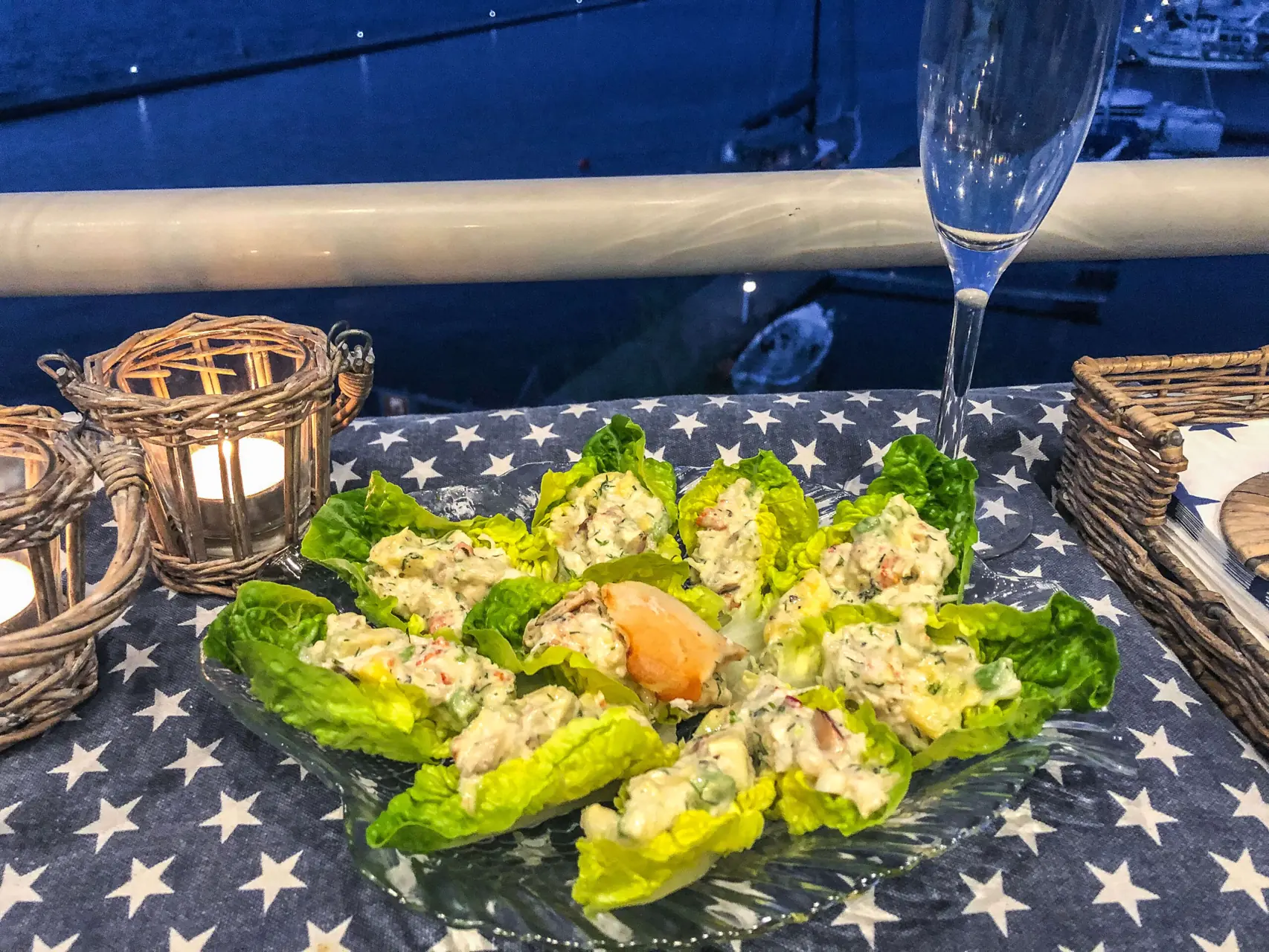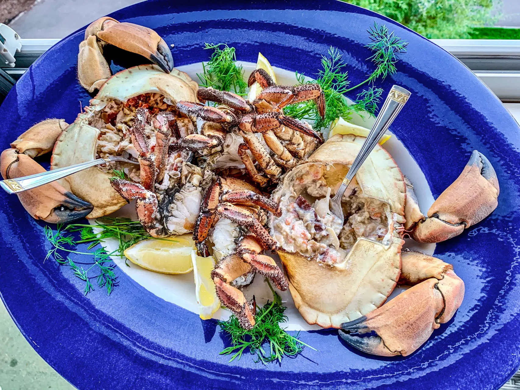 Det hender vi får flere krabber enn vi trenger i øyeblikket. Da lager vi hjemmelagede fylte krabbeskjell og legger dem i fryseren. Ved siste fangst hadde vi to krabber til overs og fylte hver av dem med ca 200 gram krabbekjøtt. Det tar tid med rensingen, men vi gleder oss over all hamstring.