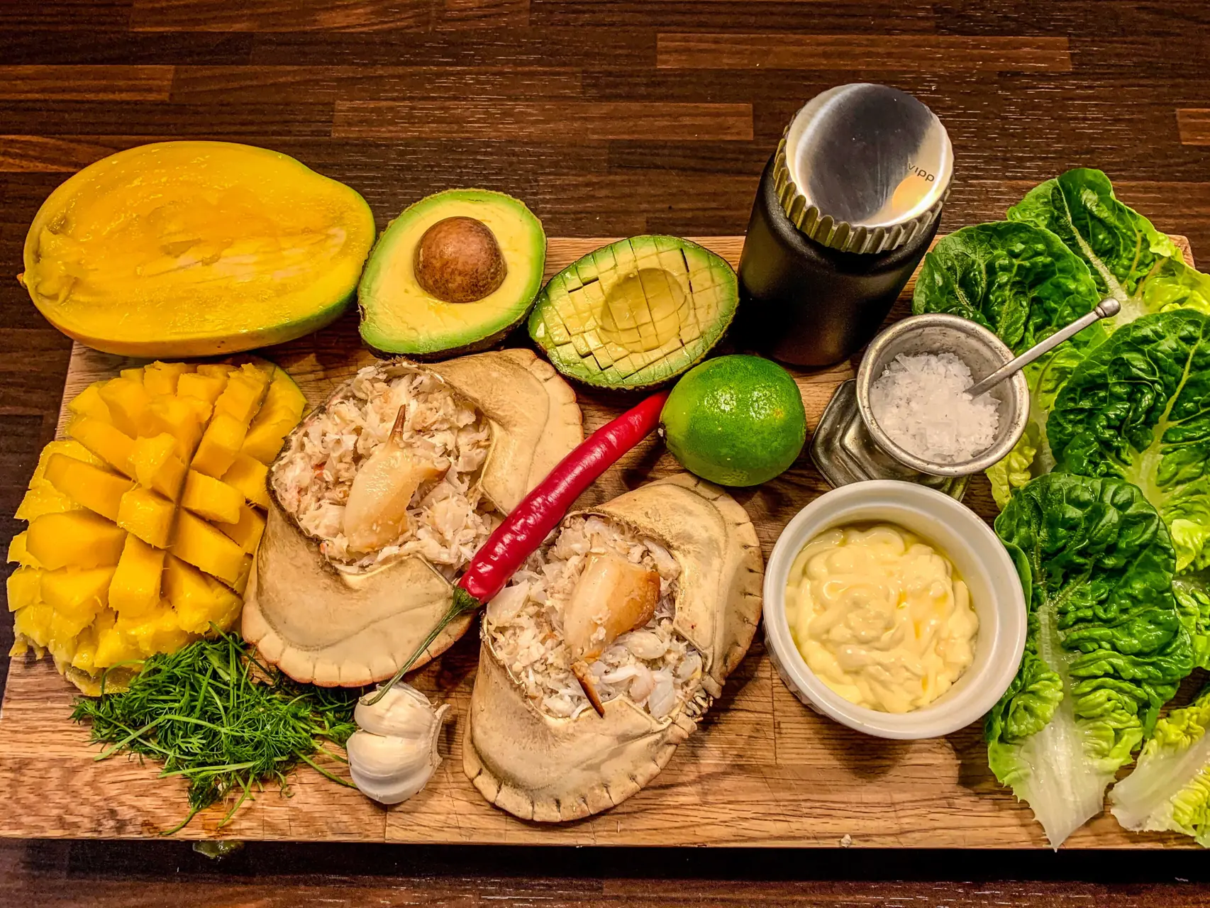 Del mango og avocado i terninger og bland sammen i krabberøren. Smak til med salt og pepper.