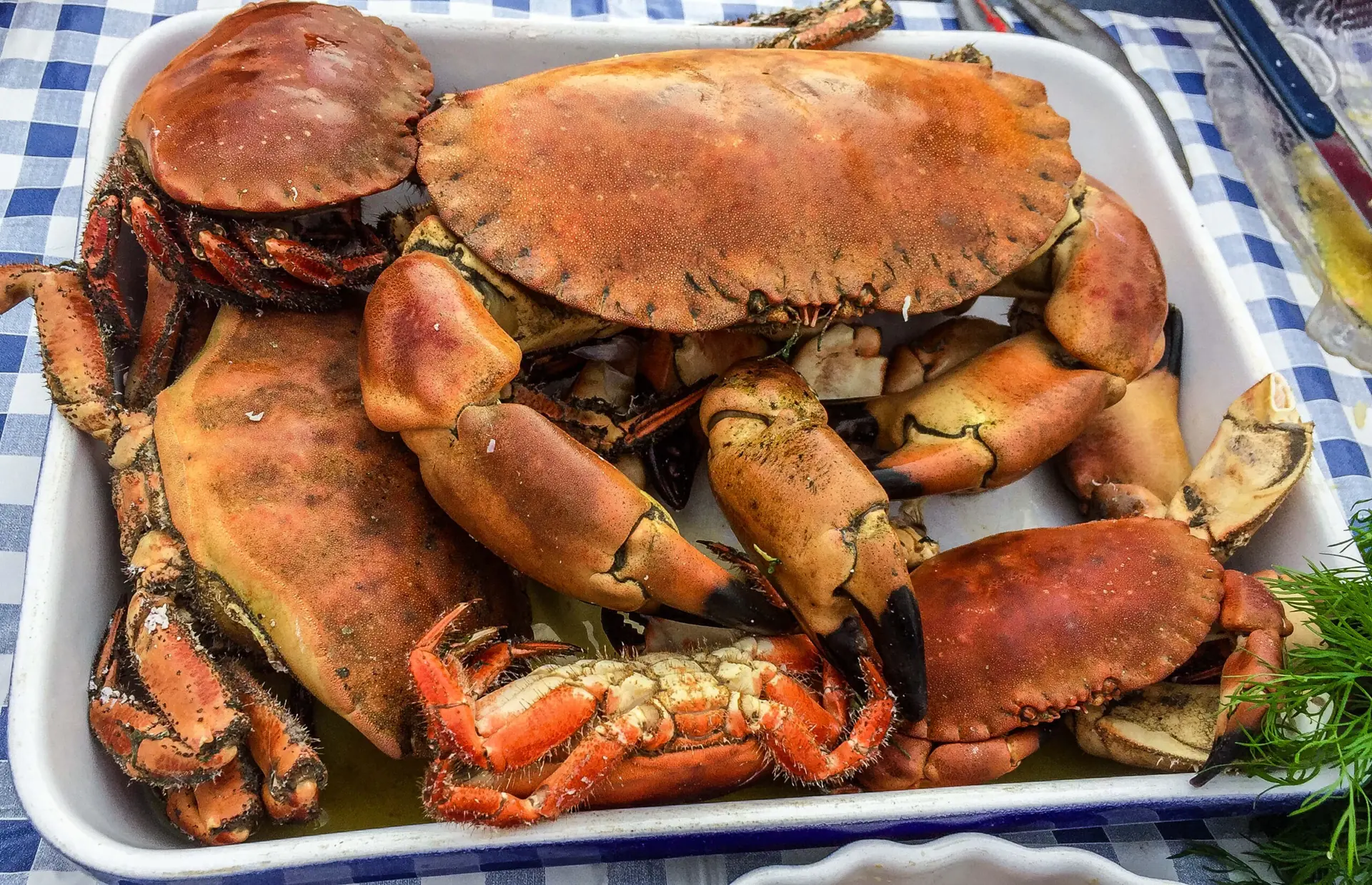 For at gjestene skal kunne fordype seg i skjell og ben og klør, er det viktig at du dekker bordet med hummergafler og en nøtteknekker. Etter at krabben er delt og paven fjernet, deles kroppen i 2 eller 4. Dette for lettere å komme til med hummergaffelen. La bena sitte på. Disse kan gjestene dele og pirke ut kjøttet fra. Det er også tillatt å suge ut kjøttet. Fjern de grå gjellene. Løsne gjerne ”brunmaten” i skjellet med en teskje og legg det pent tilbake.