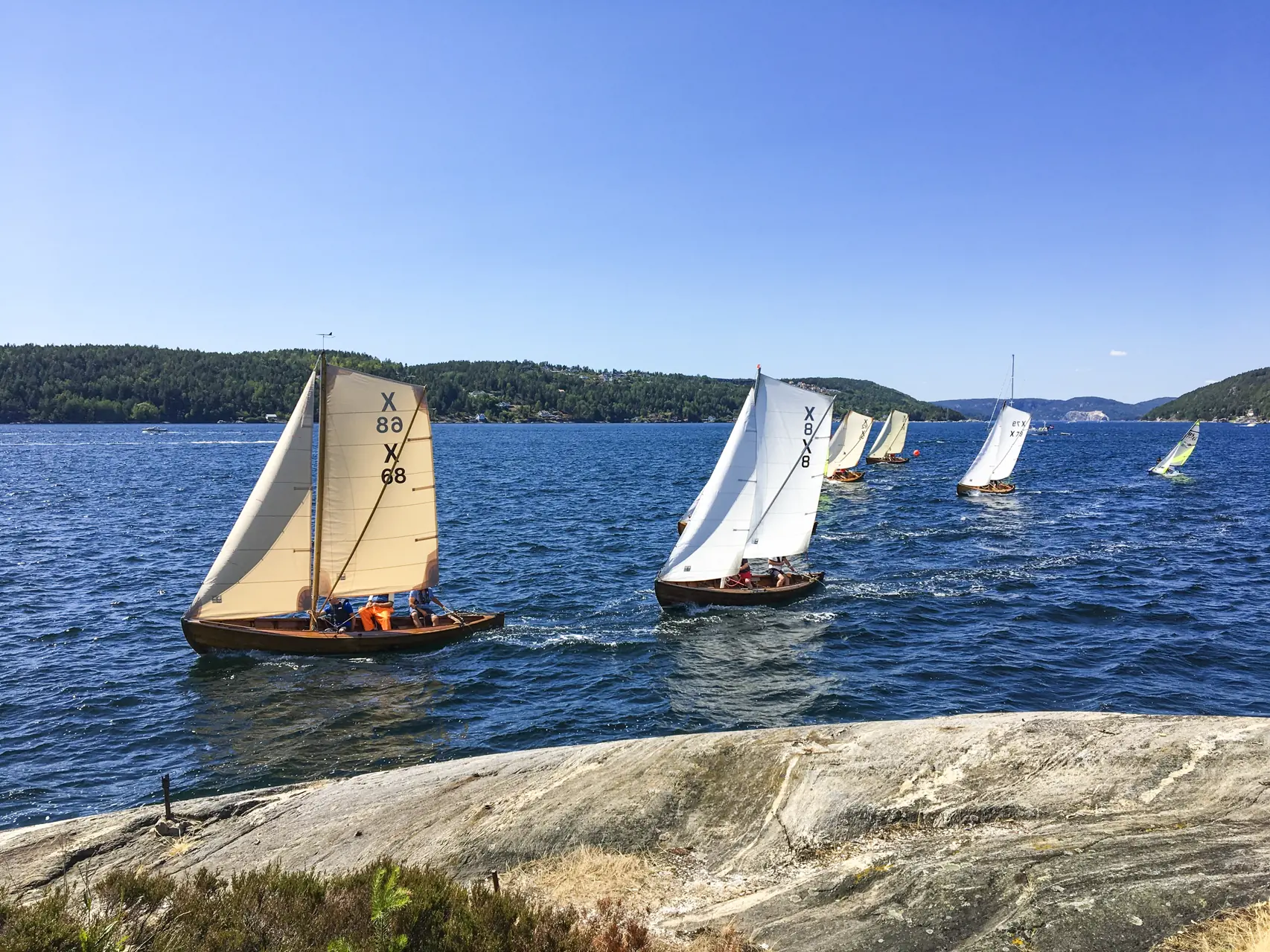 Regattaen skytes igang. Akkurat passe sørvestlig vind hjelper flåten av BB-11-er, RS Fevaer, Kogger og Terner.